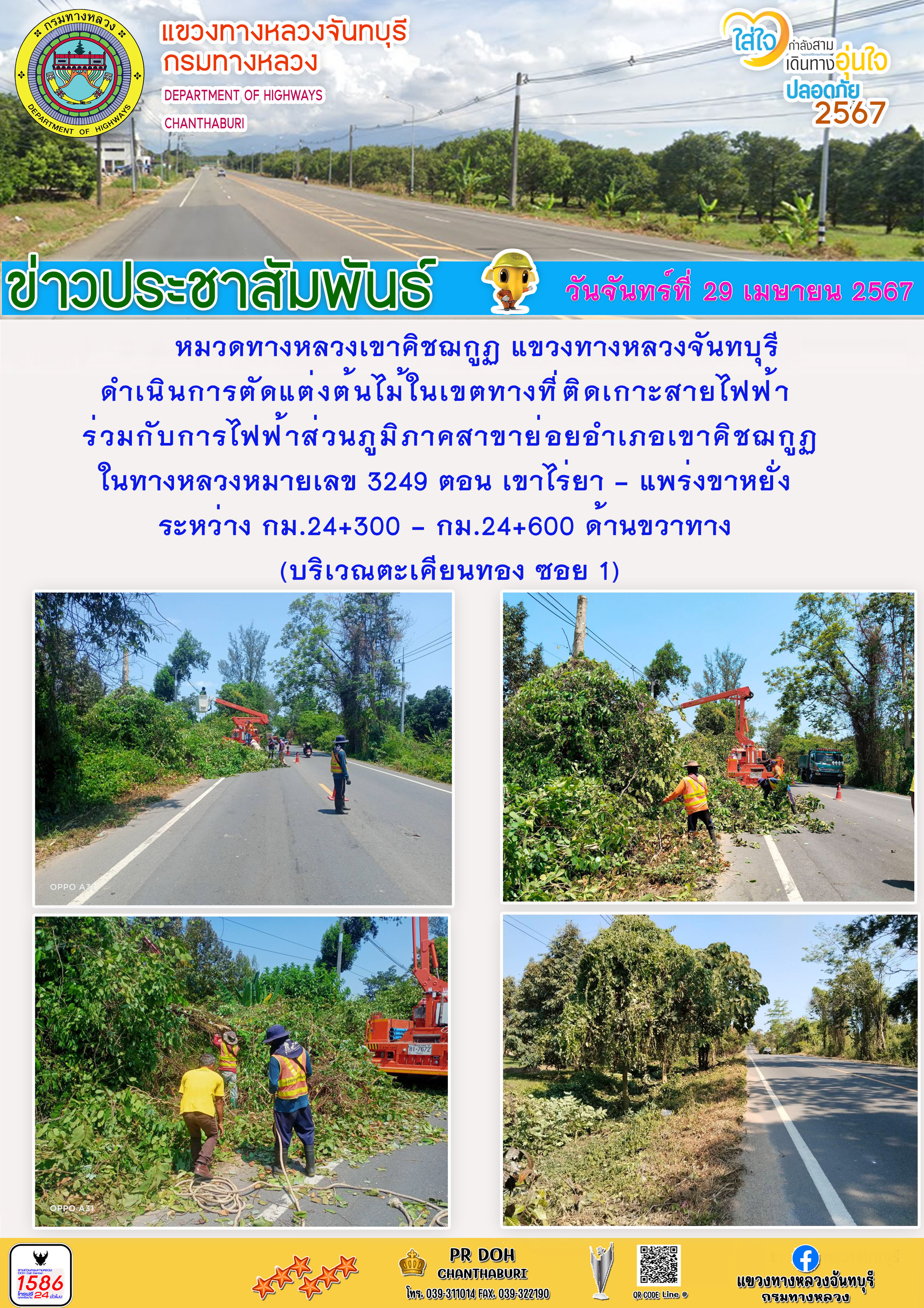 ดำเนินการตัดแต่งต้นไม้ในเขตทางที่ติดเกาะสายไฟฟ้า ร่วมกับการไฟฟ้าส่วนภูมิภาคสาขาย่อยอำเภอเขาคิชฌกูฏ ในทางหลวงหมายเลข 3249 ตอน เขาไร่ยา - แพร่งขาหยั่ง