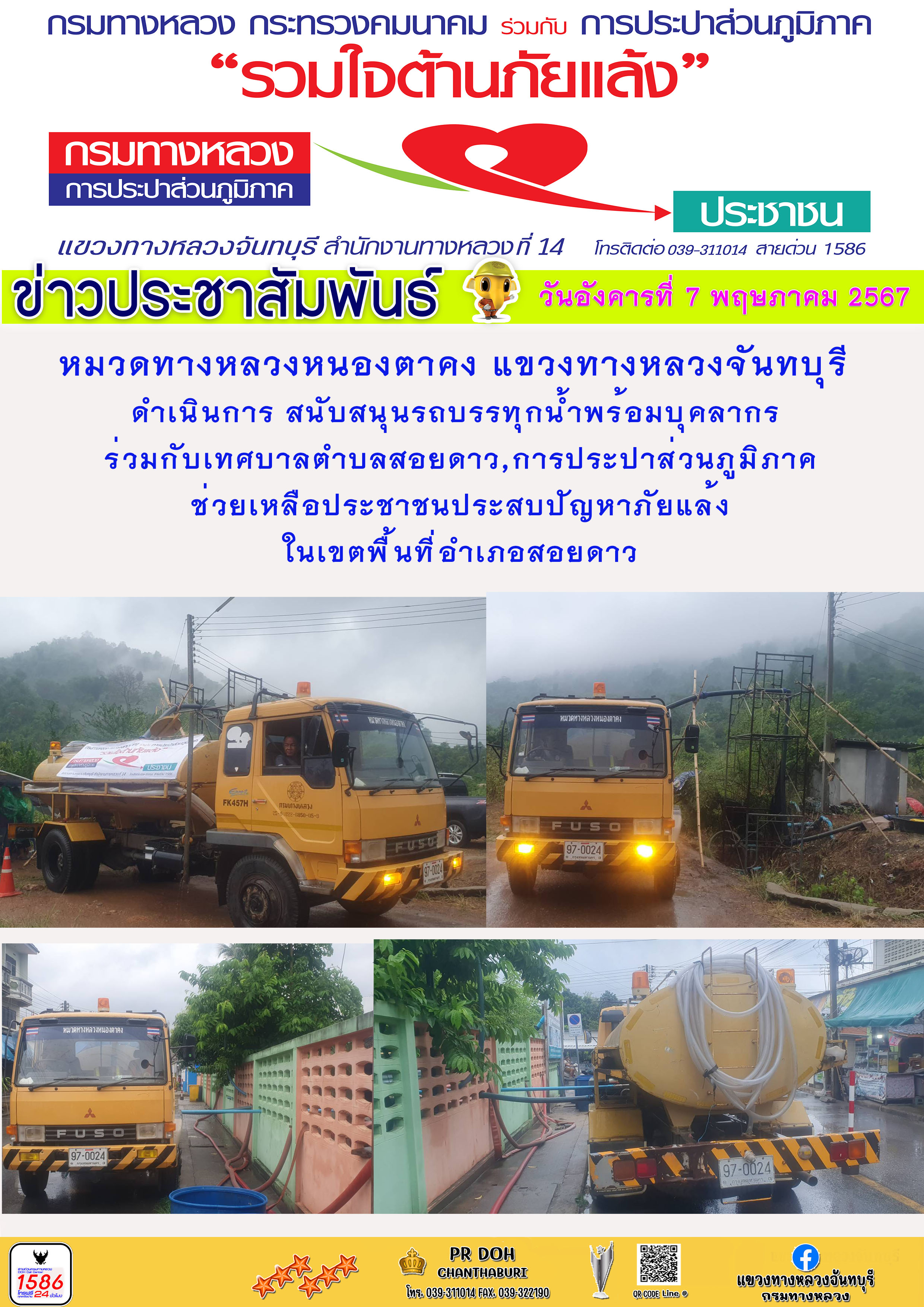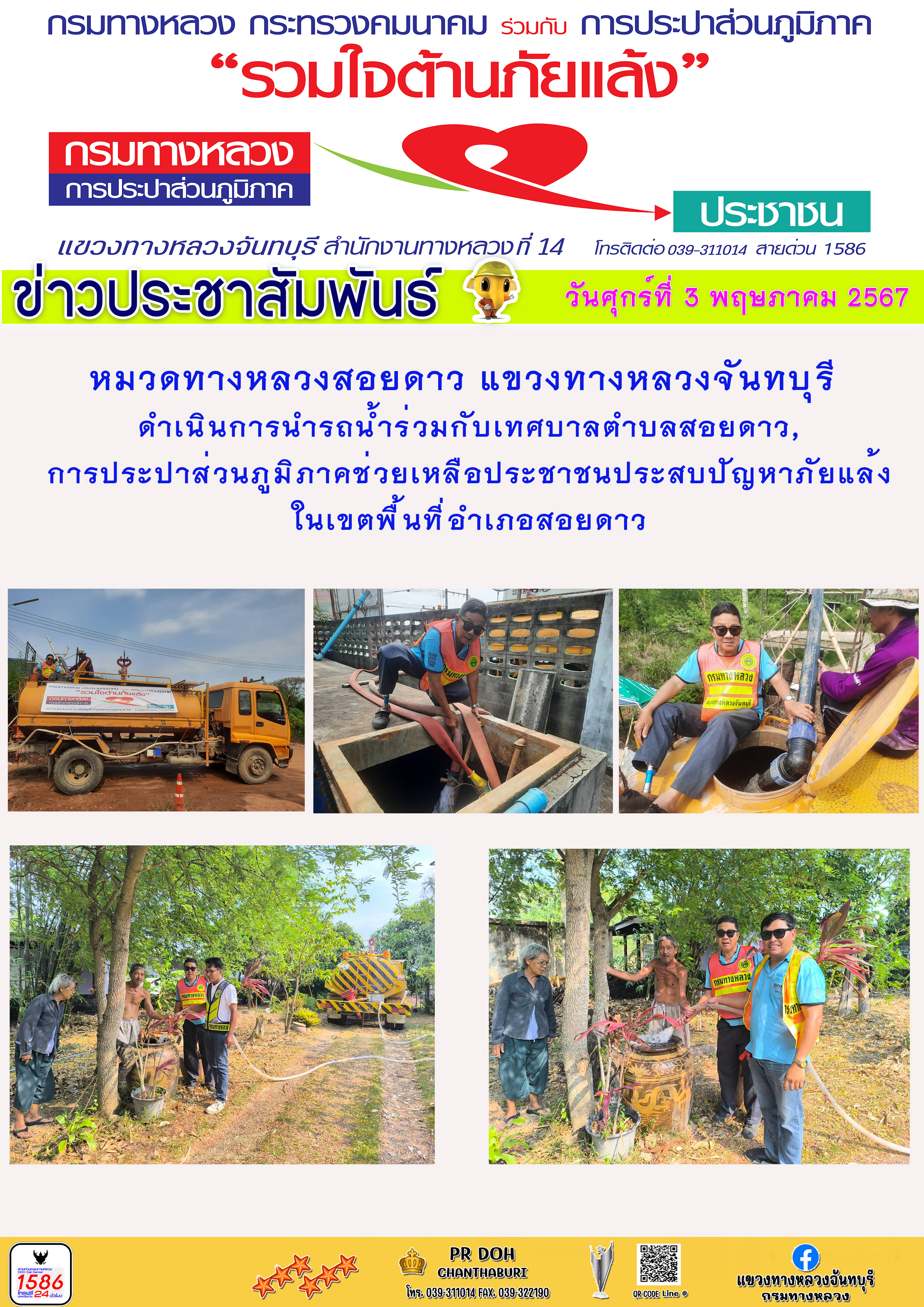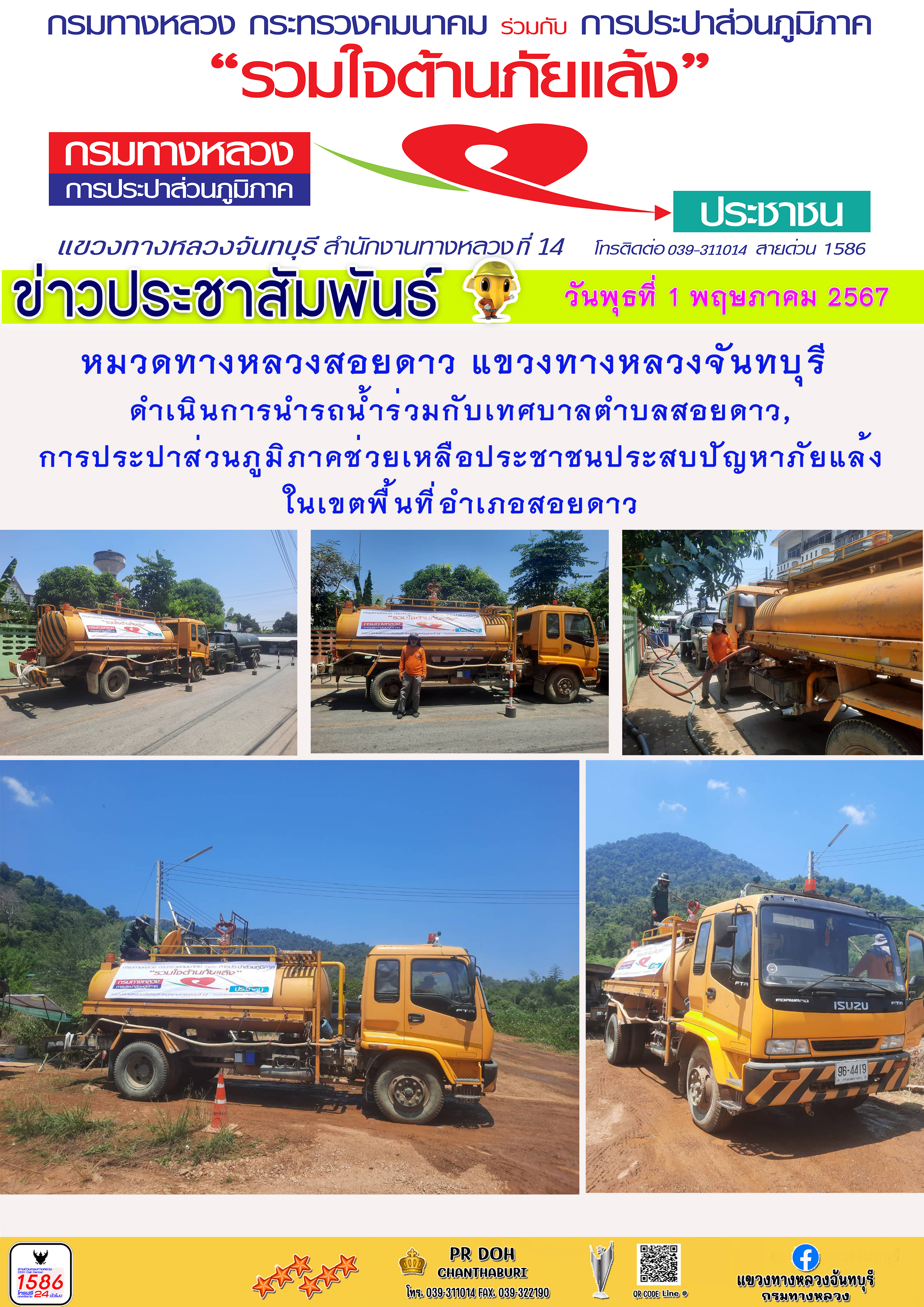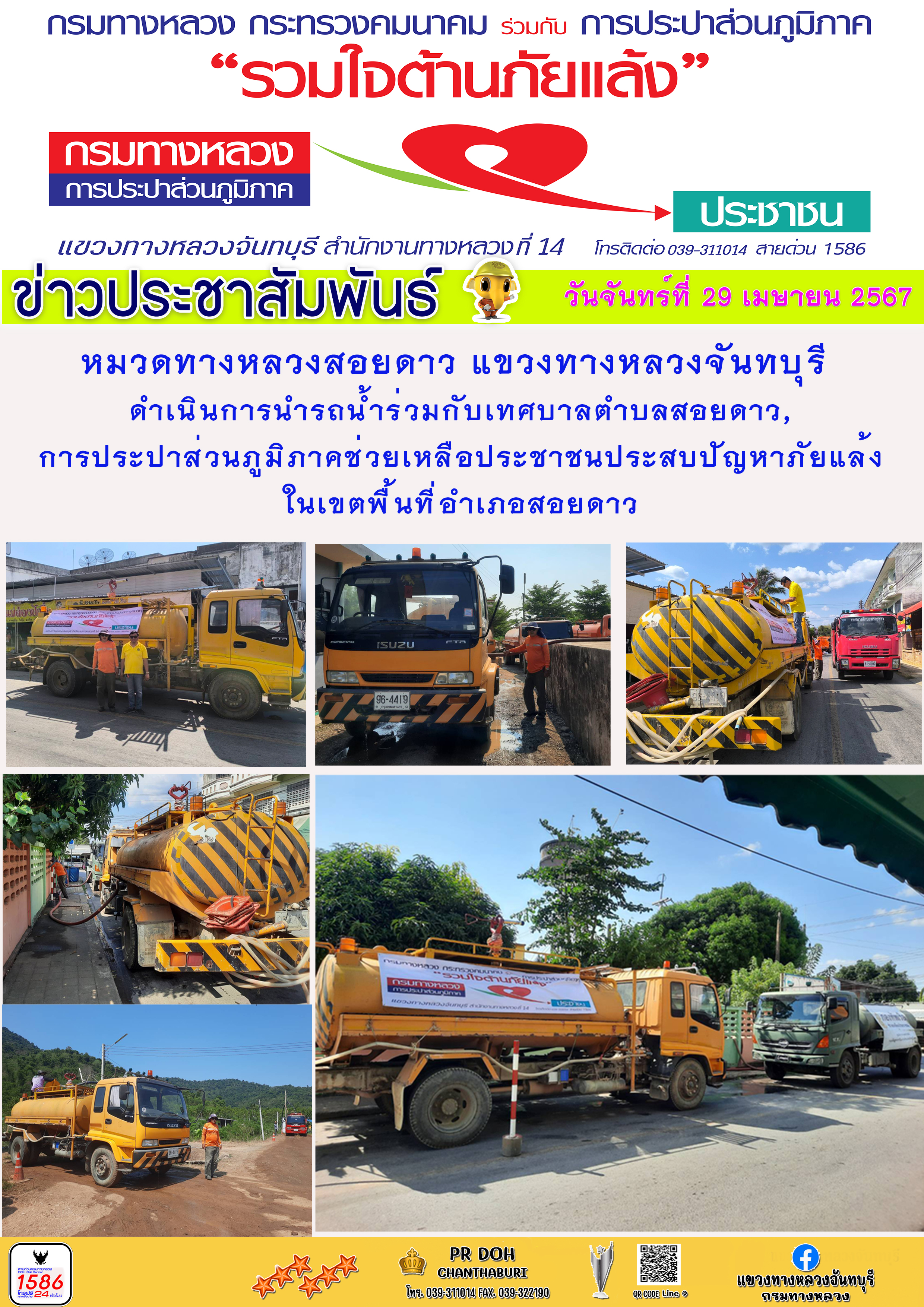 แขวงทางหลวงจันทบุรี ขอประชาสัมพันธ์ ----------------------------------------- วันจันทร์ที่ 29 เมษายน 2567 หมวดทางหลวงสอยดาว แขวงทางหลวงจันทบุรี ดำเนินการนำรถน้ำร่วมกับเทศบาลตำบลสอยดาว,การประปาส่วนภูมิภาคช่วยเหลือประชาชนประสบปัญหาภัยแล้งในเขตพื้นที่อำเภอสอยดาว