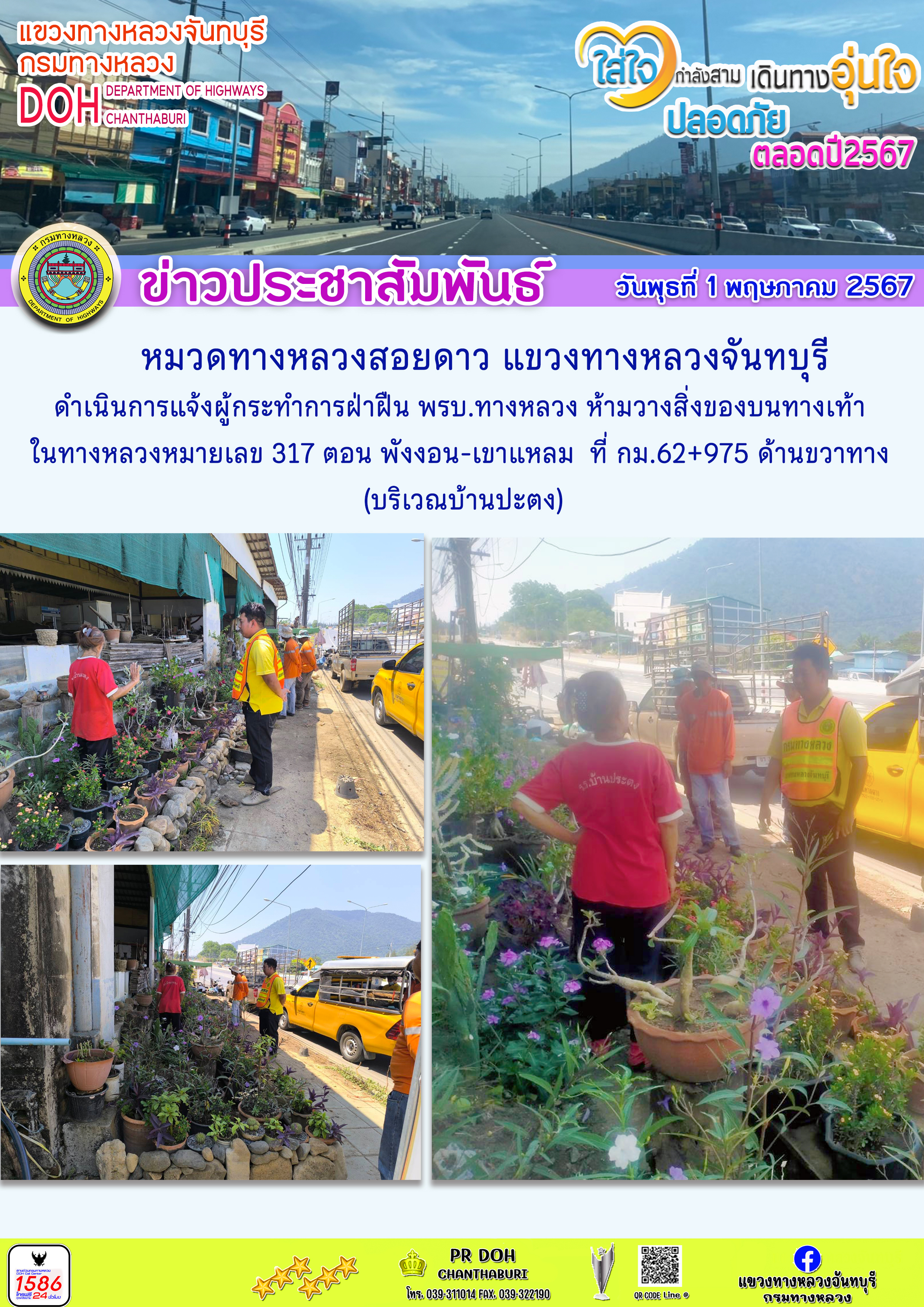 หมวดทางหลวงสอยดาว แขวงทางหลวงจันทบุรี ดำเนินการแจ้งผู้กระทำการฝ่าฝืน พรบ.ทางหลวง ห้ามวางสิ่งของบนทางเท้า ในทางหลวงหมายเลข 317