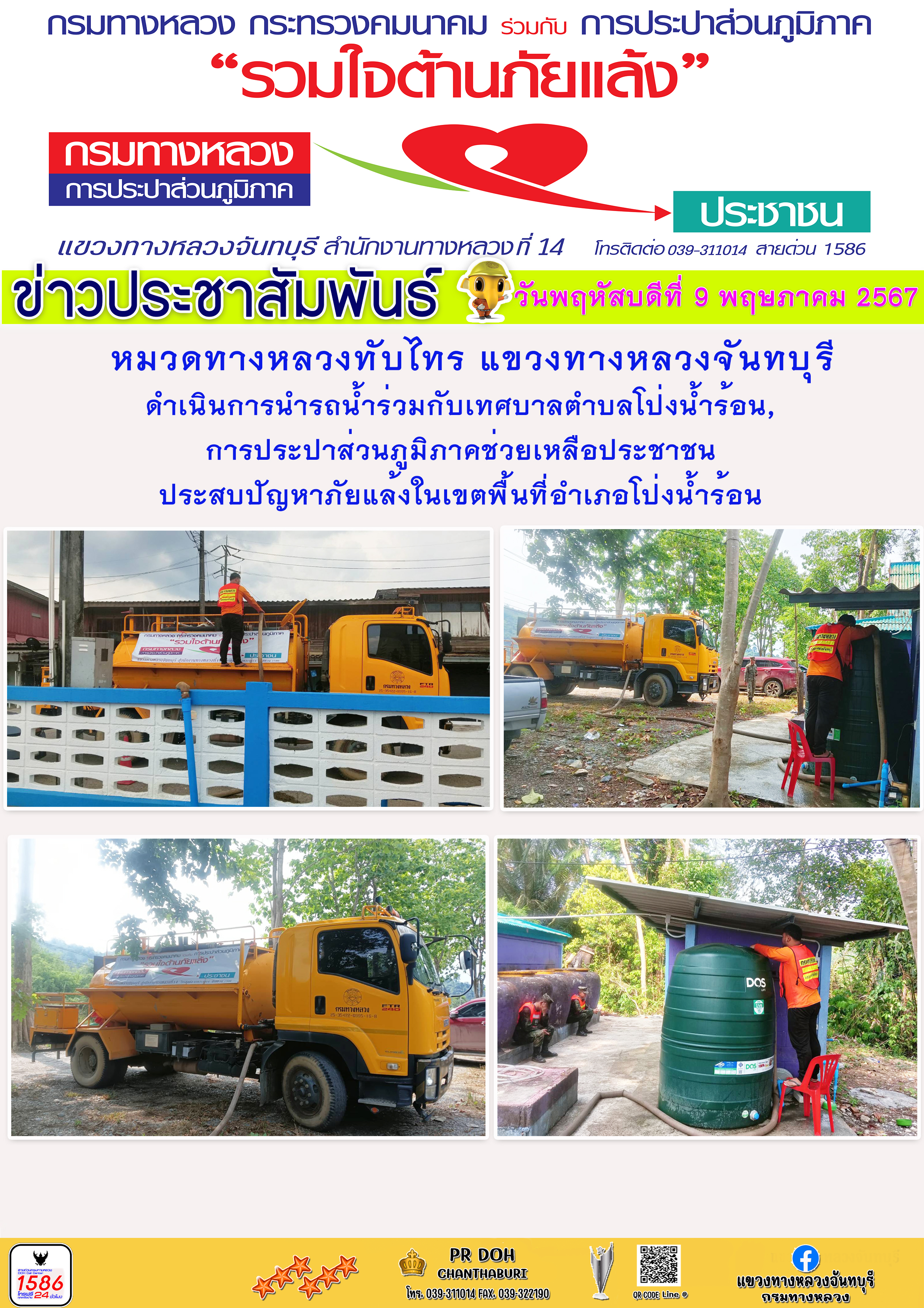 หมวดทางหลวงทับไทร แขวงทางหลวงจันทบุรี ดำเนินการนำรถน้ำช่วยเหลือประชาชน”โครงการรวมใจต้านภัยแล้ง” ในทางหลวงหมายเลข 317 ตอน หน้าค่ายตชด. - พังงอน (บริเวณที่ว่าการอำเภอโป่งน้ำร้อน ,สำนักงานตรวจคนเข้าเมือง, สภ.โป่งน้ำร้อน)