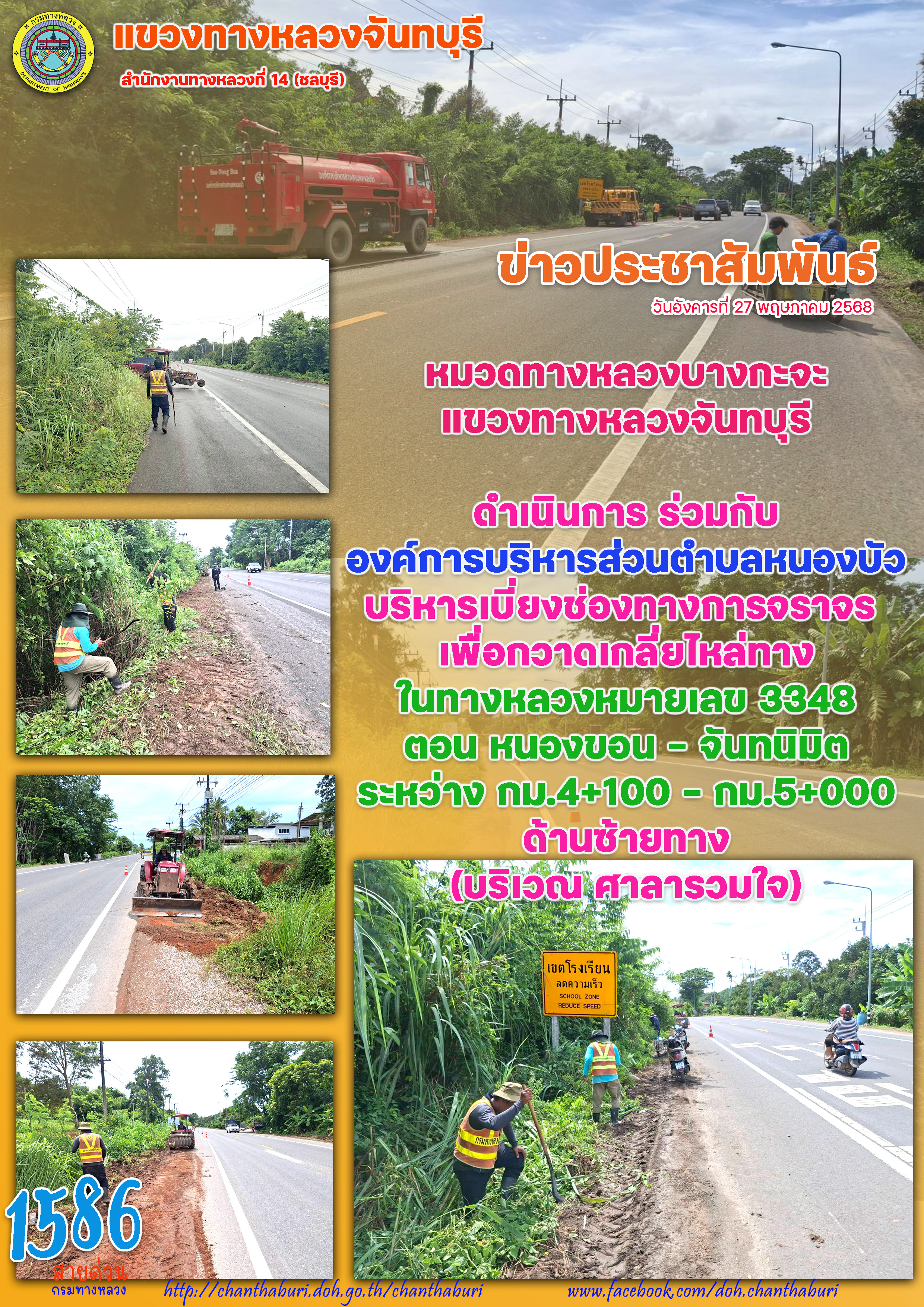 หมวดทางหลวงบางกะจะ แขวงทางหลวงจันทบุรีดำเนินการ ร่วมกับ องค์การบริหารส่วนตำบลหนองบัวบริหารเบี่ยงช่องทางการจราจร เพื่อกวาดเกลี่ยไหล่ทางในทางหลวงหมายเลข 3348ตอน หนองขอน - จันทนิมิต