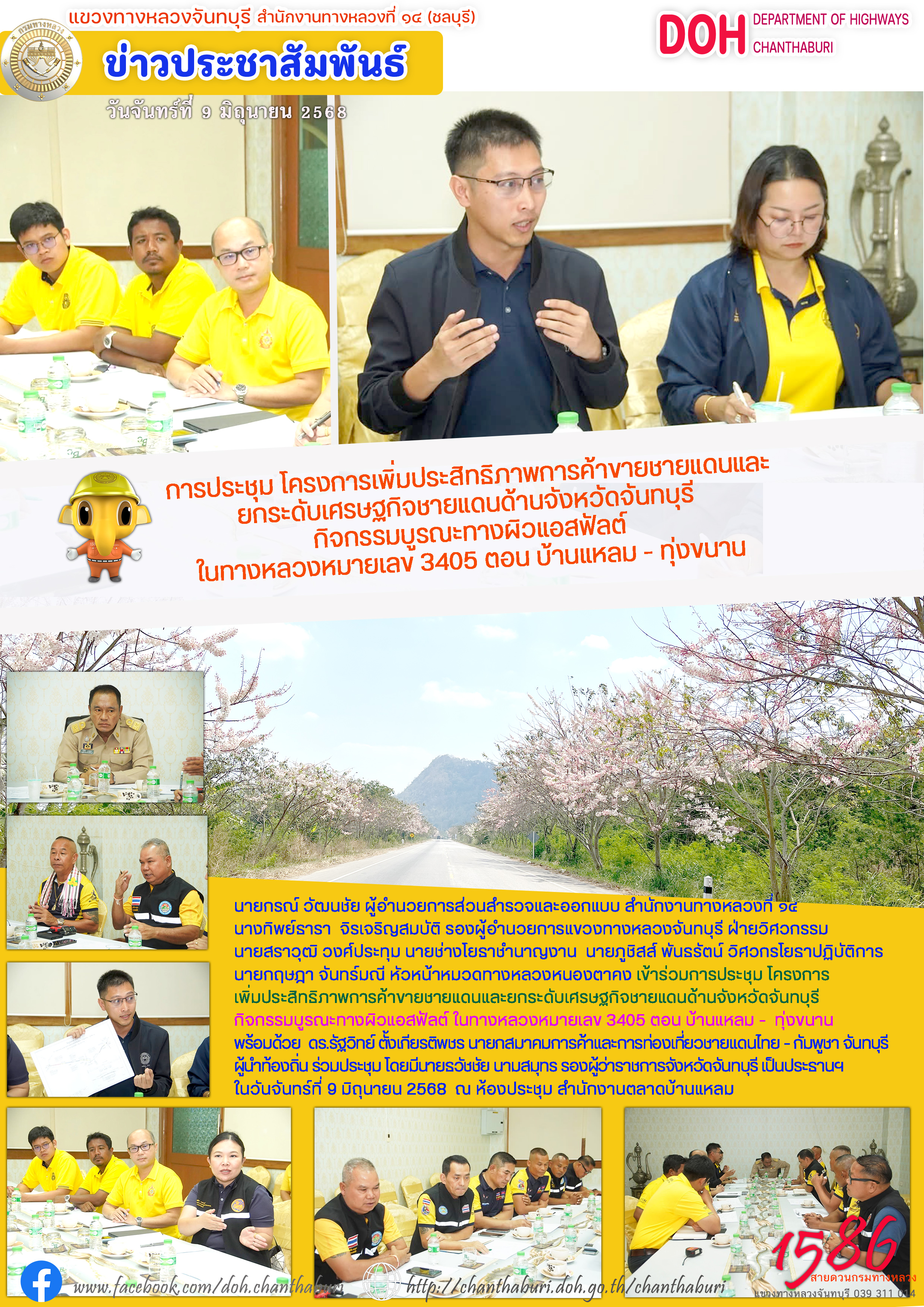 แขวงทางหลวงจันทบุรี เข้าร่วมการประชุม โครงการเพิ่มประสิทธิภาพการค้าขายชายแดนและยกระดับเศรษฐกิจชายแดนด้านจังหวัดจันทบุรี กิจกรรมบูรณะทางผิวแอสฟัลต์ ในทางหลวงหมายเลข 3405 ตอน บ้านแหลม - ทุ่งขนาน