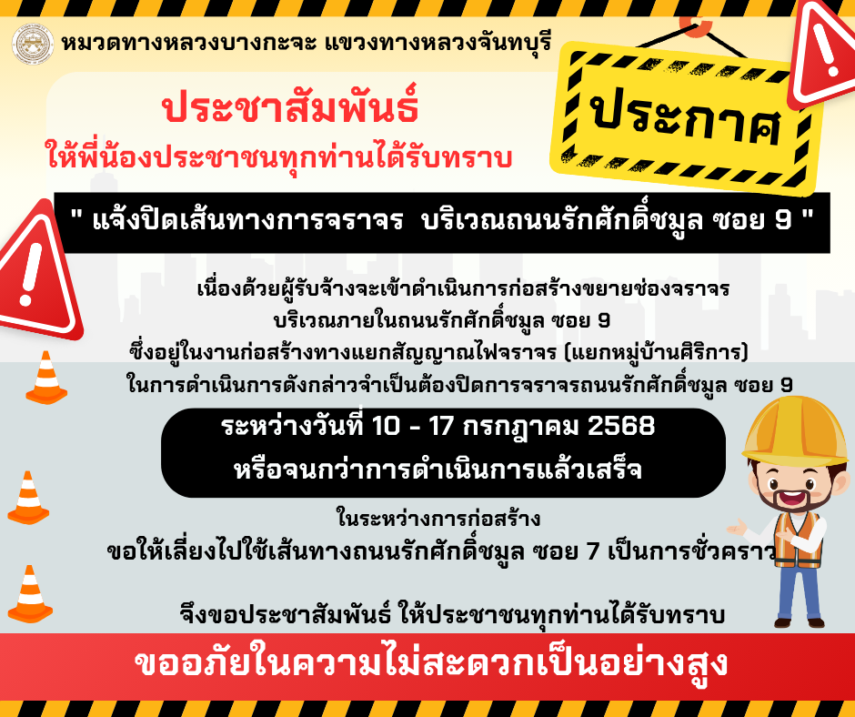 " แจ้งปิดเส้นทางการจราจร บริเวณถนนรักศักดิ์ชมูล ซอย 9 " ระหว่างวันที่ 10-17 กรกฎาคม 2568 หรือ จนกว่าจะแล้วเสร็จ