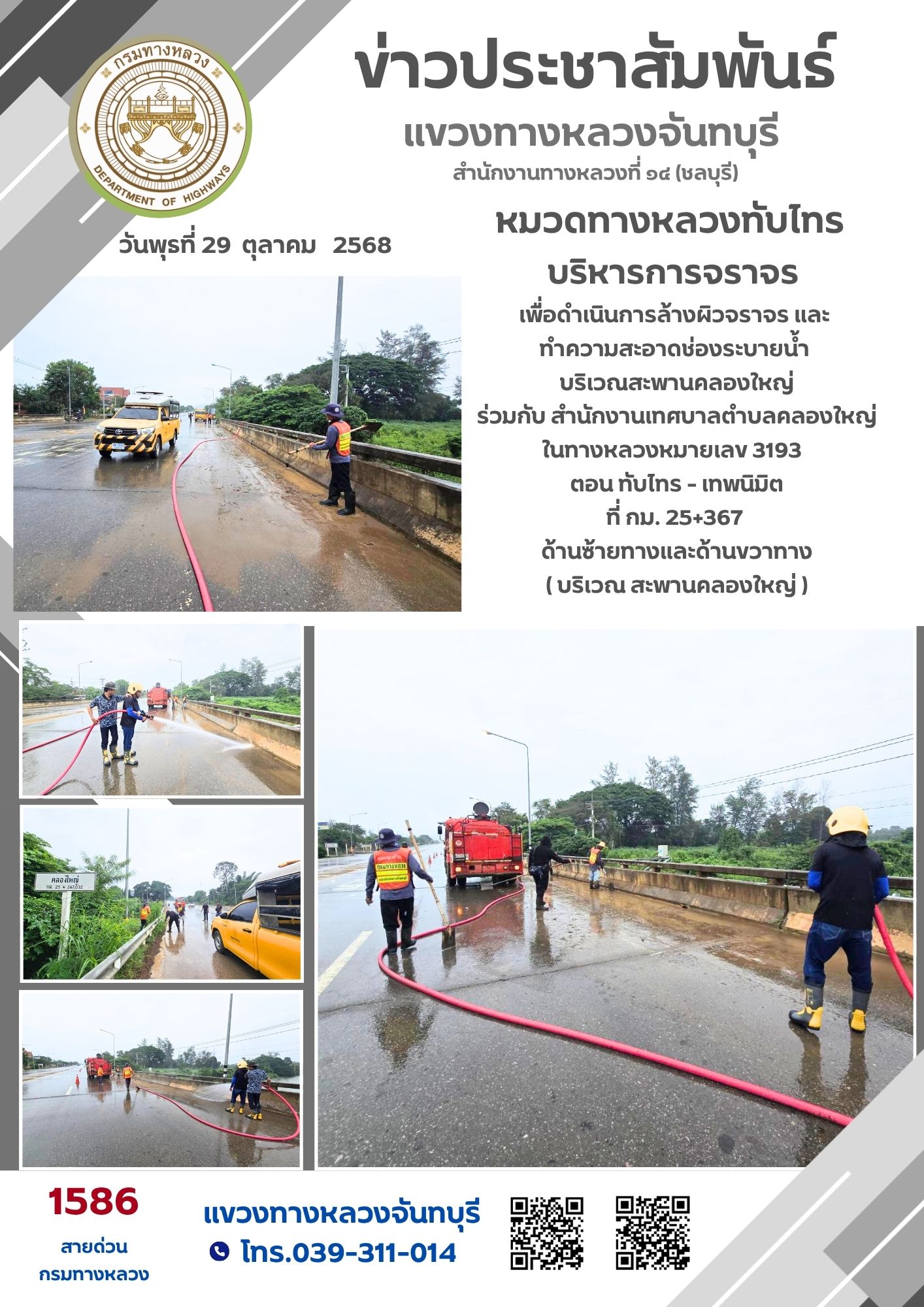 หมวดทางหลวงทับไทร แขวงทางหลวงจันทบุรี บริหารการจราจร เพื่อดำเนินการล้างผิวจราจร และ ทำความสะอาดช่องระบายน้ำ บริเวณสะพานคลองใหญ่ ร่วมกับ สำนักงานเทศบาลตำบลคลองใหญ่
