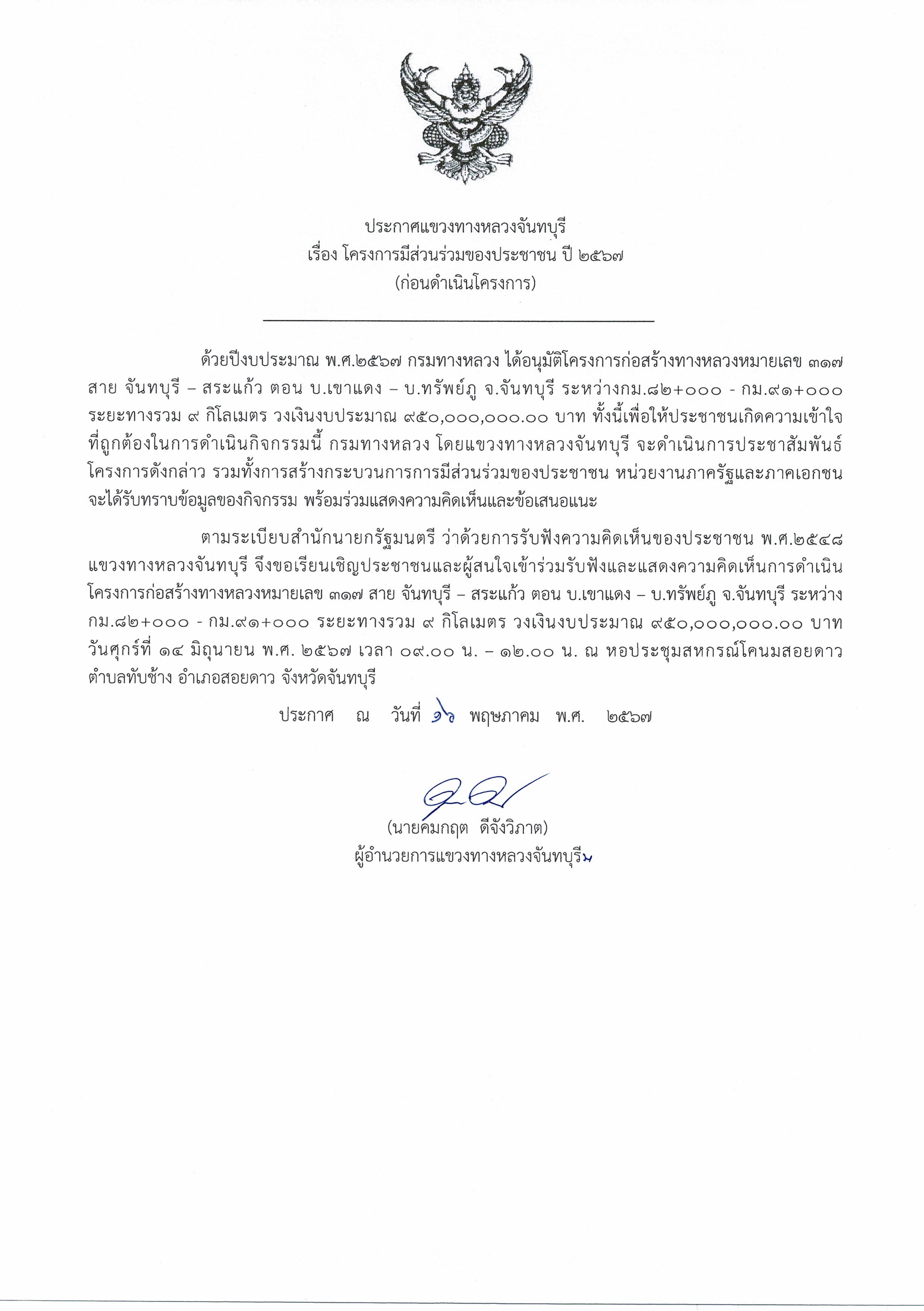 ขอเรียนเชิญประชาชนและผู้สนใจเข้าร่วมรับฟังและแสดงความคิดเห็น การดำเนินโครงการก่อสร้างโครงข่ายทางหลวงแผ่นดิน ทางหลวงหมายเลข 317 สาย จันทบุรี - สระแก้ว ตอน บ.เขาแดง - บ.ทรัพย์ภู ระหว่าง กม.82+000 - กม.91+000