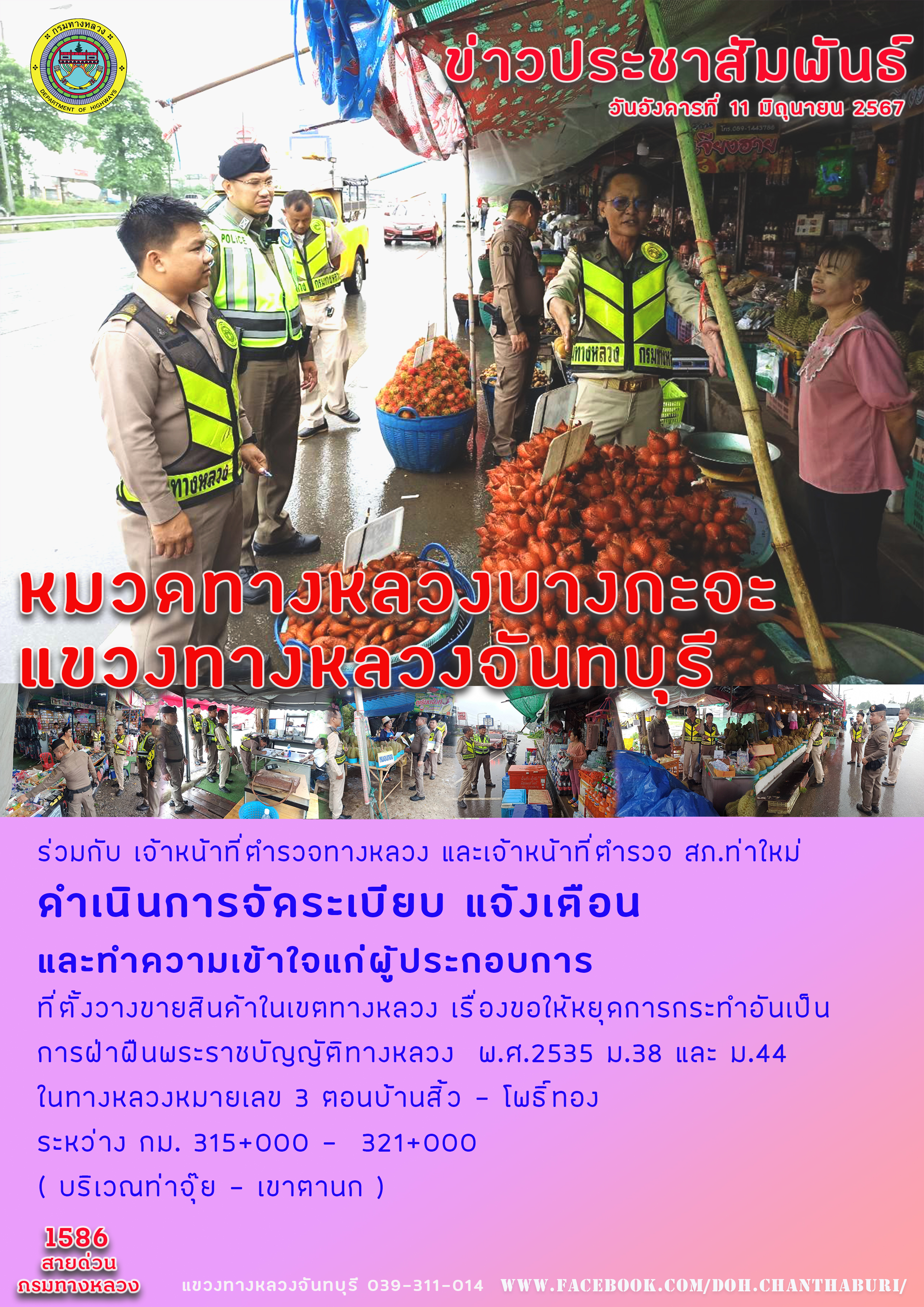 หมวดทางหลวงบางกะจะ ดำเนินการจัดระเบียบ แจ้งเตือน และทำความเข้าใจ แก่ผู้ประกอบการที่ตั้งวางขายสินค้าในเขตทางหลวง