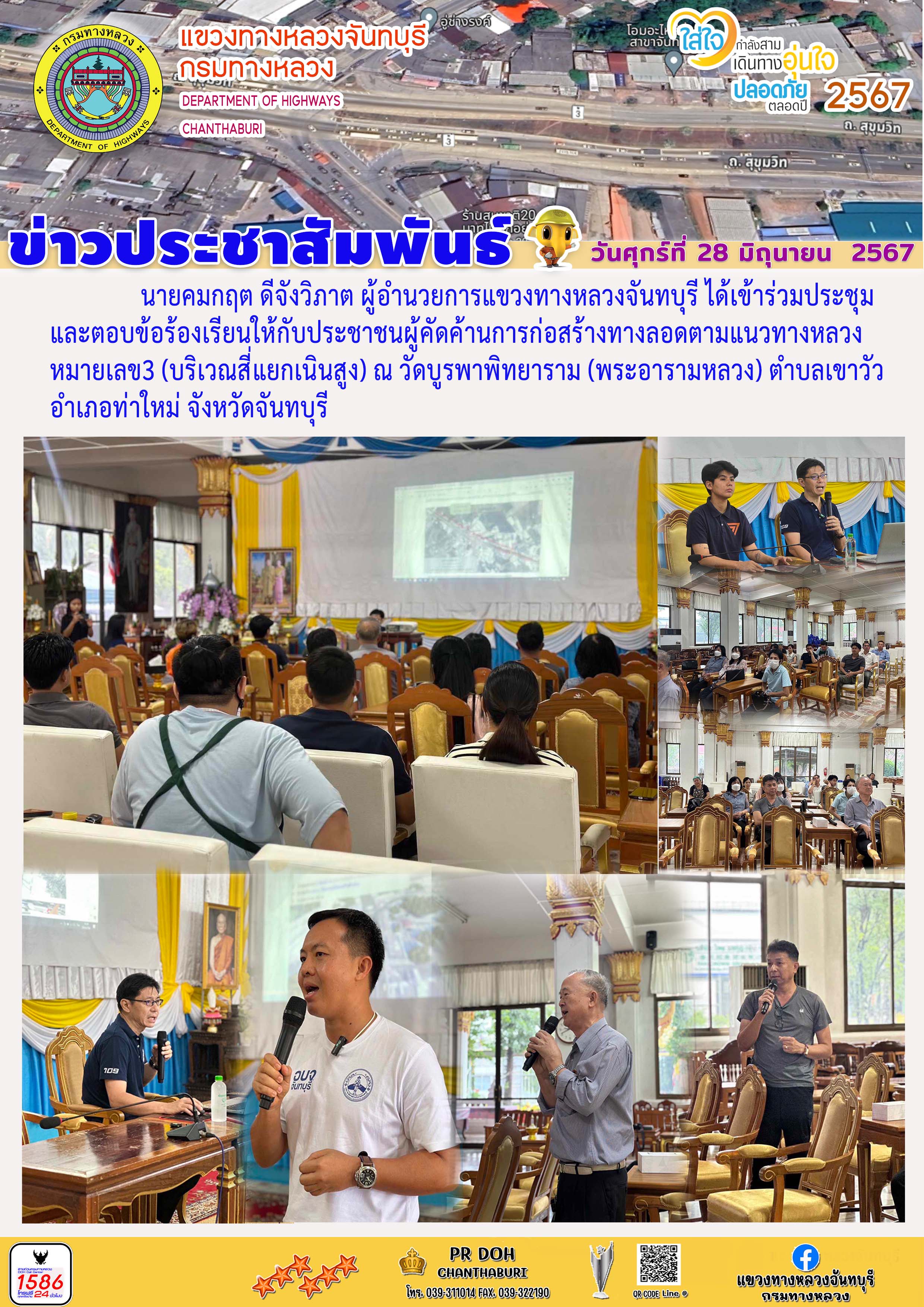 แขวงทางหลวงจันทบุรี ได้เข้าร่วมประชุมและตอบข้อร้องเรียนให้กับประชาชนผู้คัดค้านการก่อสร้างทางลอดตามแนวทางหลวงหมายเลข3