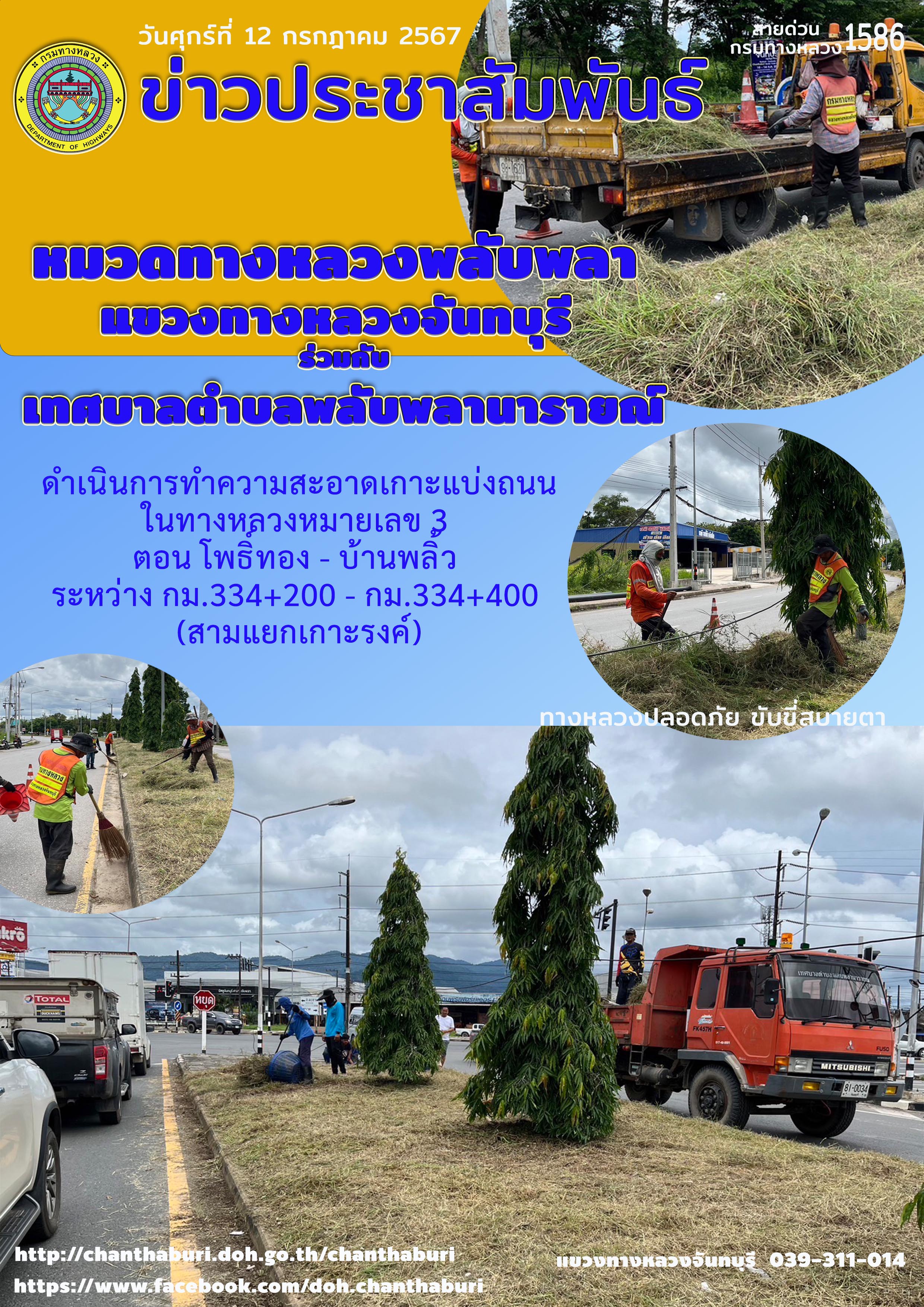 หมวดทางหลวงพลับพลาแขวงทางหลวงจันทบุรี ร่วมกับเทศบาลตำบลพลับพลานารายณ์ ดำเนินการทำความสะอาดเกาะแบ่งถนน
