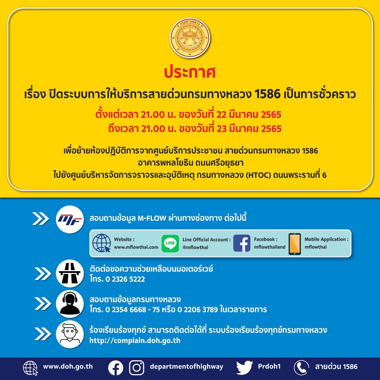 ด้วยศูนย์บริการประชาชนสายด่วนกรมทางหลวง 1586 จะทำการย้ายห้องปฏิบัติการจากอาคารพหลโยธิน ถนนศรีอยุธยา ไปยังศูนย์บริหารจัดการจราจรและอุบัติเหตุกรมทางหลวง (HTOC) ถนนพระราม 6 จึงมีความจำเป็นต้องปิดระบบการให้บริการสายด่วน 1586 เป็นการชั่วคราว ตั้งแต่เวลา 21.00 น. ของวันที่ 22 มีนาคม 2565 ถึงเวลา 21.00 น. ของวันที่ 23 มีนาคม 2565