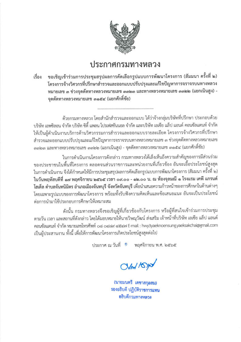 สรุปผลการประชุมสรุปผลการคัดเลือกรูปแบบการพัฒนาโครงการ (สัมมนา ครั้งที่ 2) โครงการจ้างวิศวกรที่ปรึกษาสำรวจและออกแบบปรับปรุงและแก้ไขปัญหาการจราจรบนทางหลวงหมายเลข 3 ช่วงจุดตัดทางหลวงหมายเลข 3323 และทางหลวงหมายเลข 3322 (แยกเนินสูง) - จุดตัดทางหลวงหมายเลข 3154 (แยกศักดิ์ชัย)