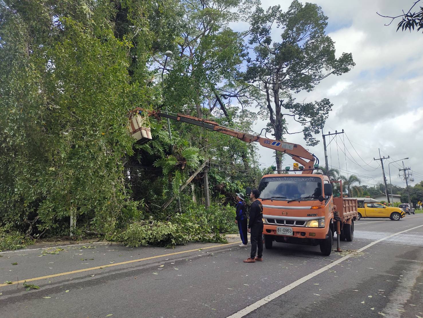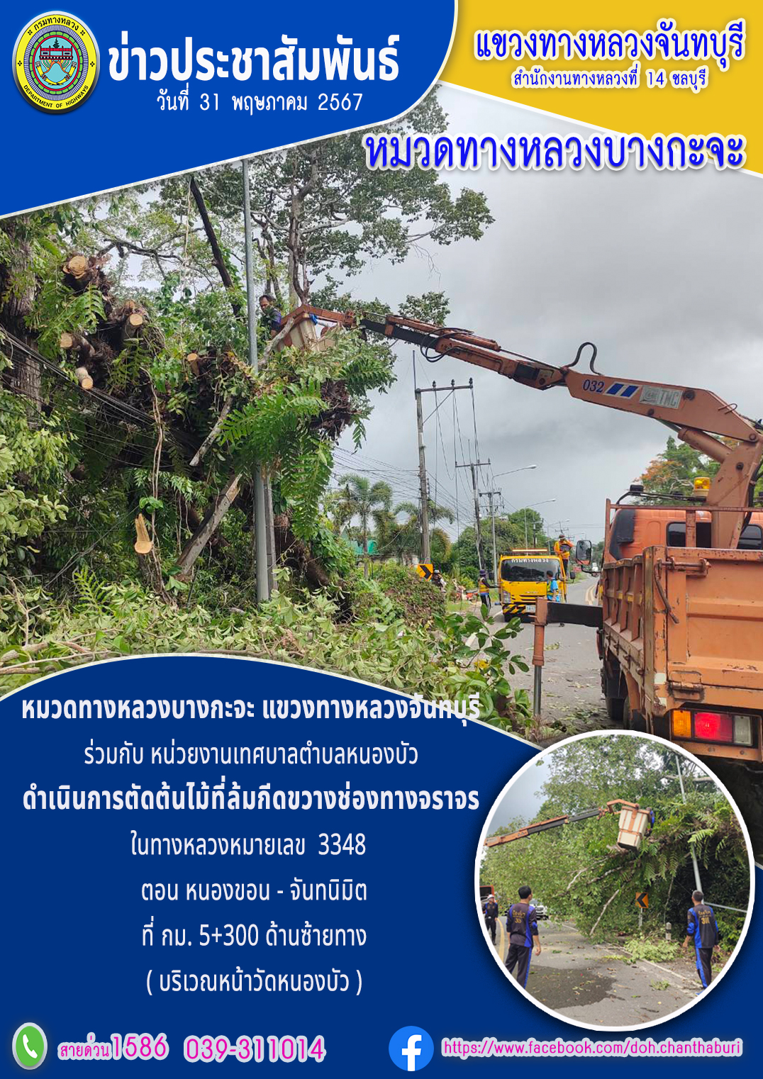 หมวดทางหลวงบางกะจะ แขวงทางหลวงจันทบุรี ร่วมกับ หน่วยงานเทศบาลตำบลหนองบัว ดำเนินการตัดต้นไม้ที่ล้มกีดขวางช่องทางจราจร ในทางหลวงหมายเลข 3348 ตอน หนองขอน - จันทนิมิต