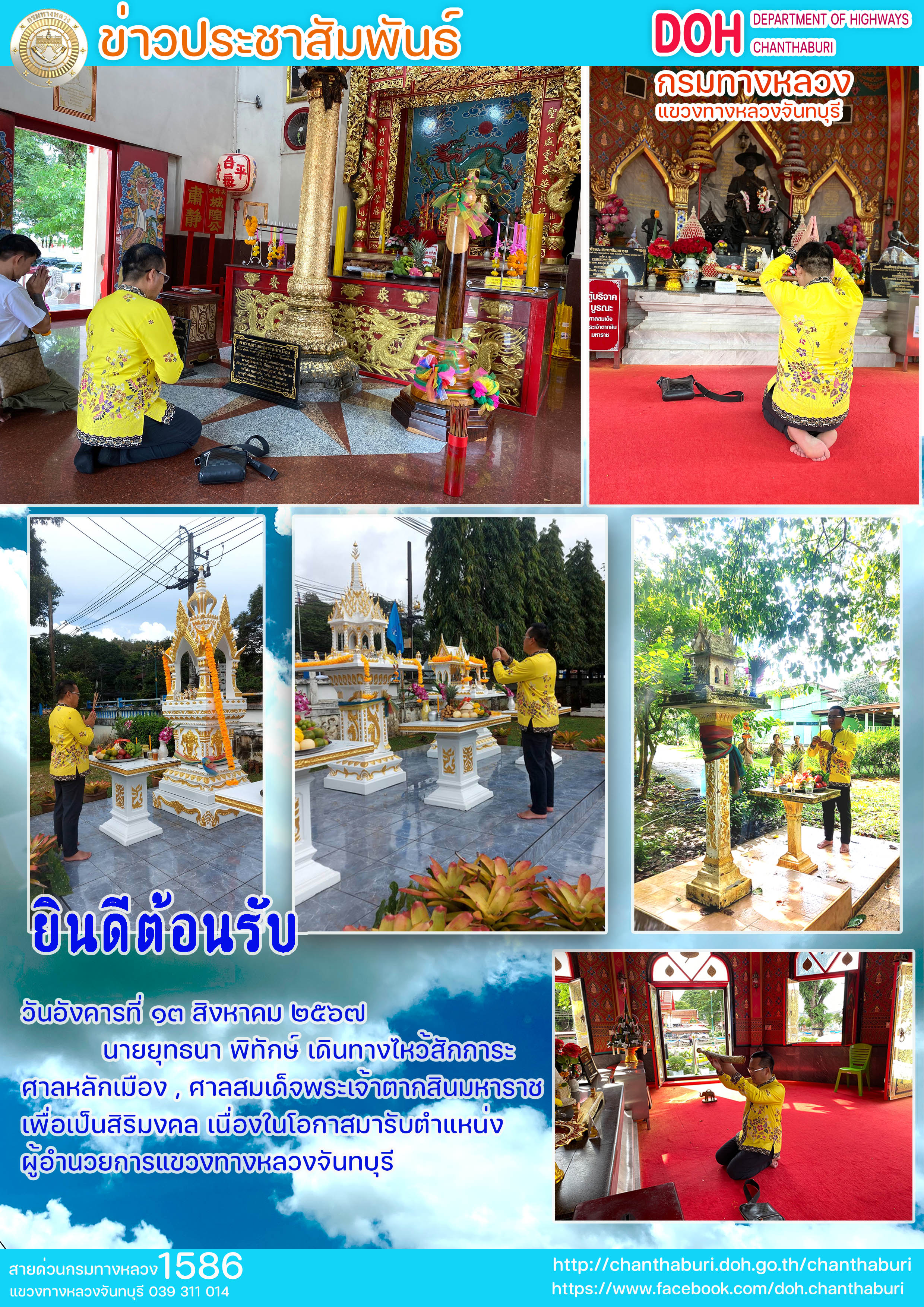 นายยุทธนา พิทักษ์ เดินทางไหว้สักการะ ศาลหลักเมือง , ศาลสมเด็จพระเจ้าตากสินมหาราช เพื่อเป็นสิริมงคล เนื่องในโอกาสมารับตำแหน่ง ผู้อำนวยการแขวงทางหลวงจันทบุรี