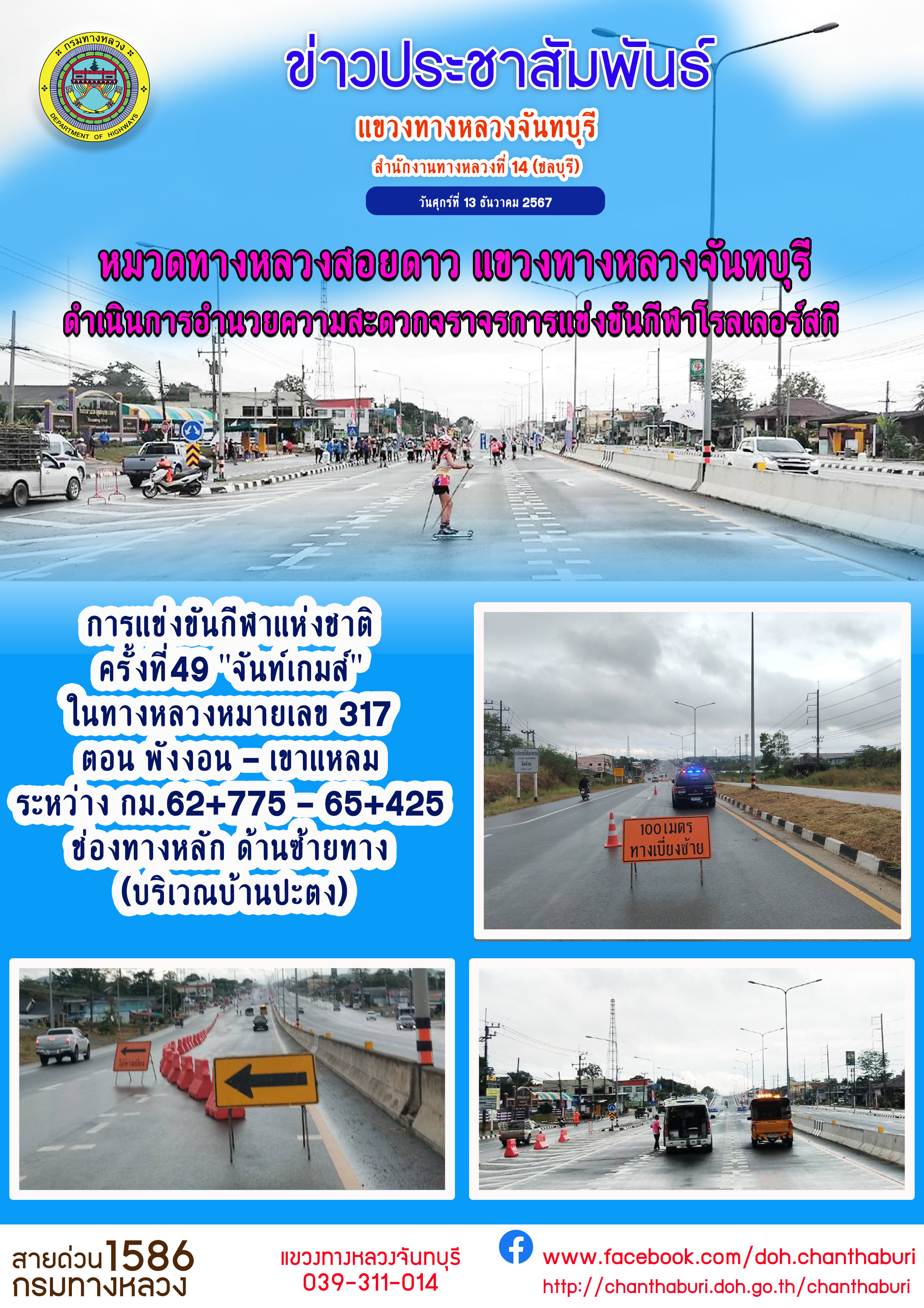 ดำเนินการอำนวยความสะดวกจราจรการแข่งขันกีฬาโรลเลอร์สกี การแข่งขันกีฬาแห่งชาติ ครั้งที่49 "จันท์เกมส์" ในทางหลวงหมายเลข 317 ตอน พังงอน - เขาแหลม ระหว่าง กม.62+775 - 65+425 ช่องทางหลัก ด้านซ้ายทาง (บริเวณบ้านปะตง)