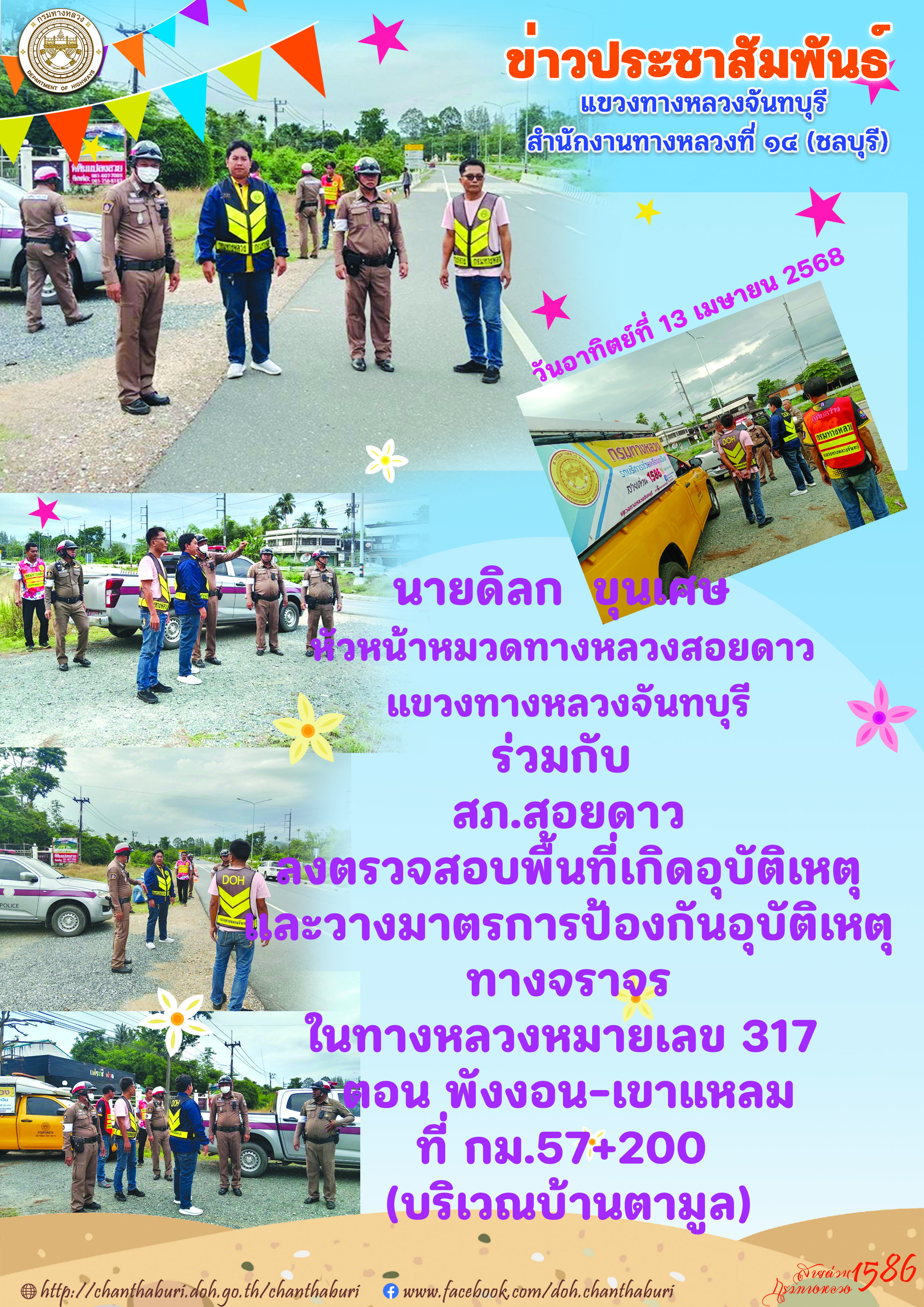 นายดิลก ขุนเศษ หัวหน้าหมวดทางหลวงสอยดาว แขวงทางหลวงจันทบุรีร่วมกับ สภ.สอยดาว ลงตรวจสอบพื้นที่เกิดอุบัติเหตุ และวางมาตรการป้องกันอุบัติเหตุทางจราจรในทางหลวงหมายเลข 317 ตอน พังงอน-เขาแหลมที่ กม.57+200 (บริเวณบ้านตามูล)
