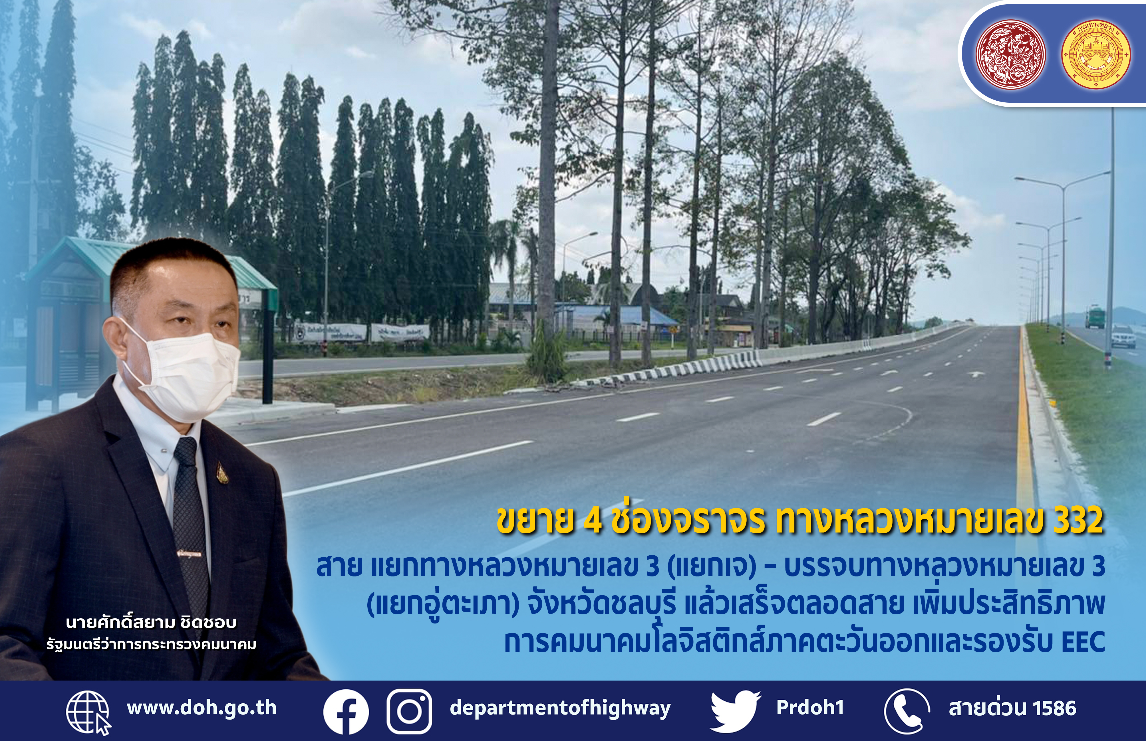 ทางหลวงหมายเลข 332 สาย แยกทางหลวงหมายเลข 3 (แยกเจ) - บรรจบทางหลวงหมายเลข 3 (แยกอู่ตะเภา) เป็นเส้นทางเชื่อมโยงตัวชุมชนถึงสถานที่สำคัญของจังหวัดชลบุรี ได้แก่ หน่วยงานราชการต่างๆ และท่าอากาศยานนานาชาติอู่ตะเภา มีจุดเริ่มต้น ที่ กม.0+000 บริเวณแยกเจ อำเภอสัตหีบ ถึงจุดสิ้นสุดที่ กม.14+487 บริเวณแยกอู่ตะเภา จังหวัดชลบุรี รวมระยะทาง 14.47 กิโลเมตร เนื่องจากในปัจจุบันมีปริมาณการจราจรเพิ่มมากขึ้น ทำให้ประชาชนไม่ได้รับความสะดวกในการเดินทาง กรมทางหลวงเล็งเห็นความสำคัญนี้ จึงดำเนินการก่อสร้างขยายเพิ่มช่องจราจรเดิมจาก 2 ช่องจราจร (ไป-กลับ) เป็นมาตรฐานทางชั้นพิเศษขนาด 4 ช่องจราจร (แบ่งทิศการจราจรฝั่งละ 2 ช่องจราจร (ไป-กลับ) ผิวจราจรเป็นแอสฟัลต์คอนกรีต ช่องจราจรกว้างช่องละ 3.5 เมตร ไหล่ทางด้านนอกกว้าง 2.5 เมตร ไหล่ทางด้านในกว้าง 1.5 เมตร พร้อมปรับปรุงเกาะกลาง ก่อสร้างสะพานข้ามแยกจำนวน 2 แห่ง คือ สะพานข้ามแยกเกษมพล ช่วง กม. 10+584 และ สะพานข้ามแยกตลาดสระแก้ว ช่วง กม. 12+850 พร้อมงานติดตั้งไฟฟ้าแสงสว่างตลอดเส้นทาง งบประมาณ 797,566,000 บาท