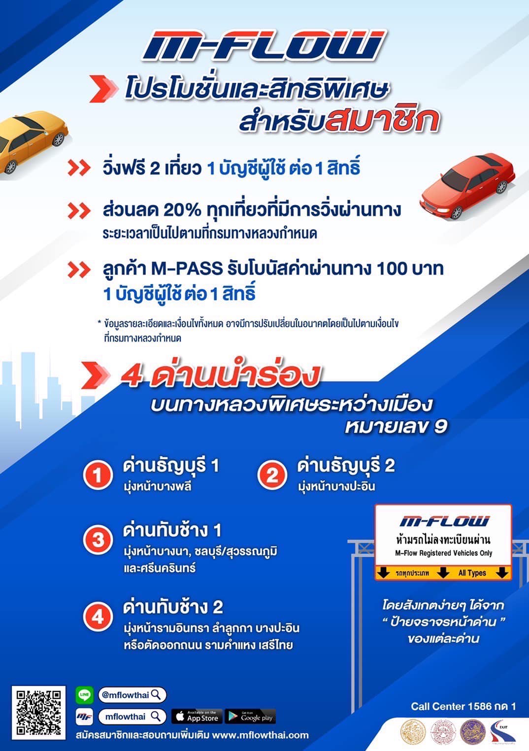 หรือป้ายทะเบียนไม่ชัดเจนไม่สามารถใช้บริการ M-Flow ได้ แต่ยังคงใช้ช่องชําระเงินสด และช่อง M-Pass Easy Pass ได้ หากสงสัยหรือต้องการสอบถามข้อมูลเพิ่มเติม โทรติดต่อได้ที่ Call Center โทร 1586 กด 1