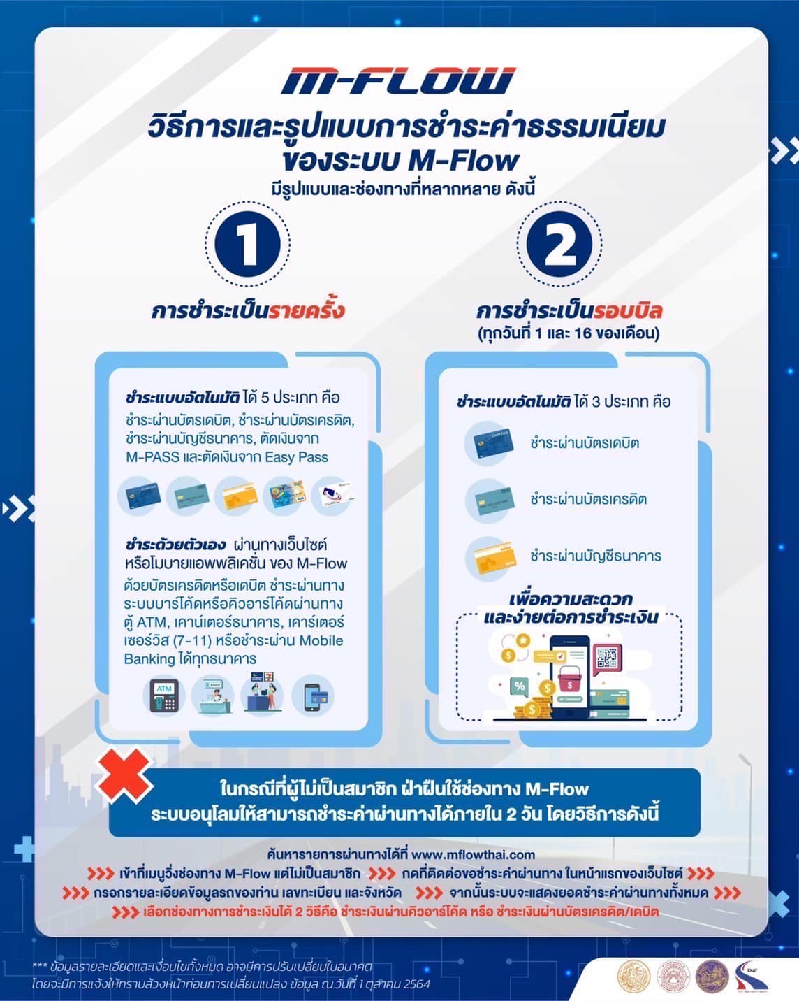 www.mflowthai.com หรือ Mobile Application MFlowThai โดยเลือกการชำระเงินผ่านบัตรเครดิต บัตรเดบิต หรือตัดเงินในบัญชี M-Pass หรือ Easy Pass ที่หลายคนมีบัญชีอยู่แล้ว
