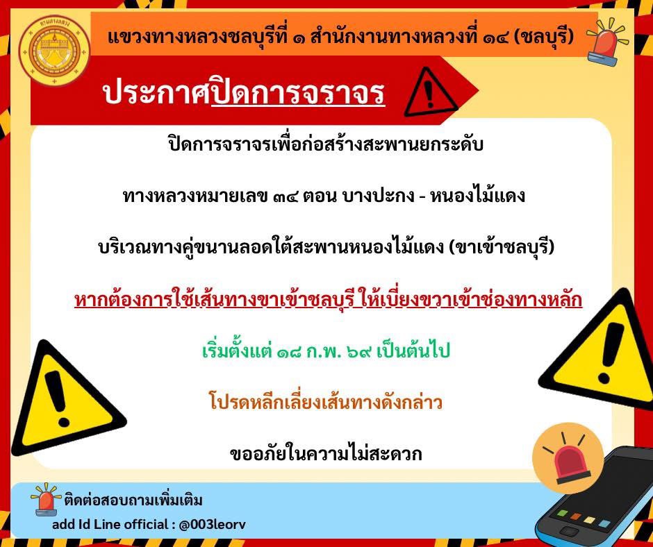 ปิดการจราจร ๑ ช่องจราจรขวา บริเวณโค้งเข้าทางเลี่ยงเมืองชลบุรี ทางหลวงหมายเลข ๓๖๑ ระหว่าง กม.๐+๐๐๐ - กม.๐+๔๐๐ เพื่อก่อสร้างสะพานข้ามแยก ระหว่างวันที่ ๒๔ กุมภาพันธ์ - ๓๑ พฤษภาคม ๒๕๖๙