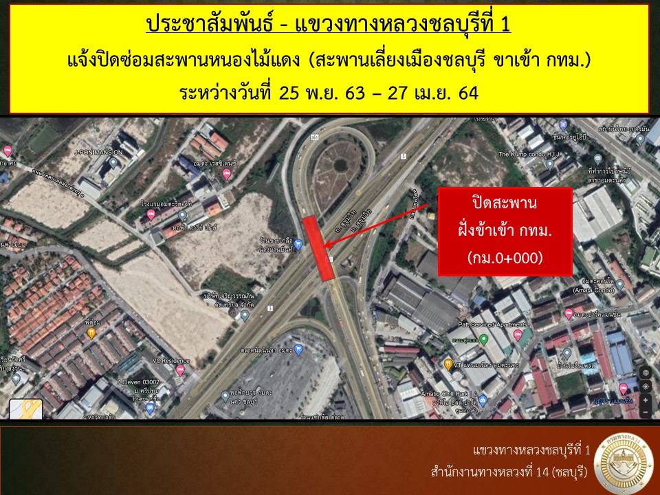บนทางหลวงหมายเลข 361 ทางเลี่ยงเมืองชลบุรี กม.0+000 ถึง กม.0+400 (ฝั่งขาเข้า กรุงเทพฯ) เพื่อบูรณะปรับปรุงพื้นสะพานเดิม จึงมีความจำเป็นต้องปิดสะพานดังกล่าว
