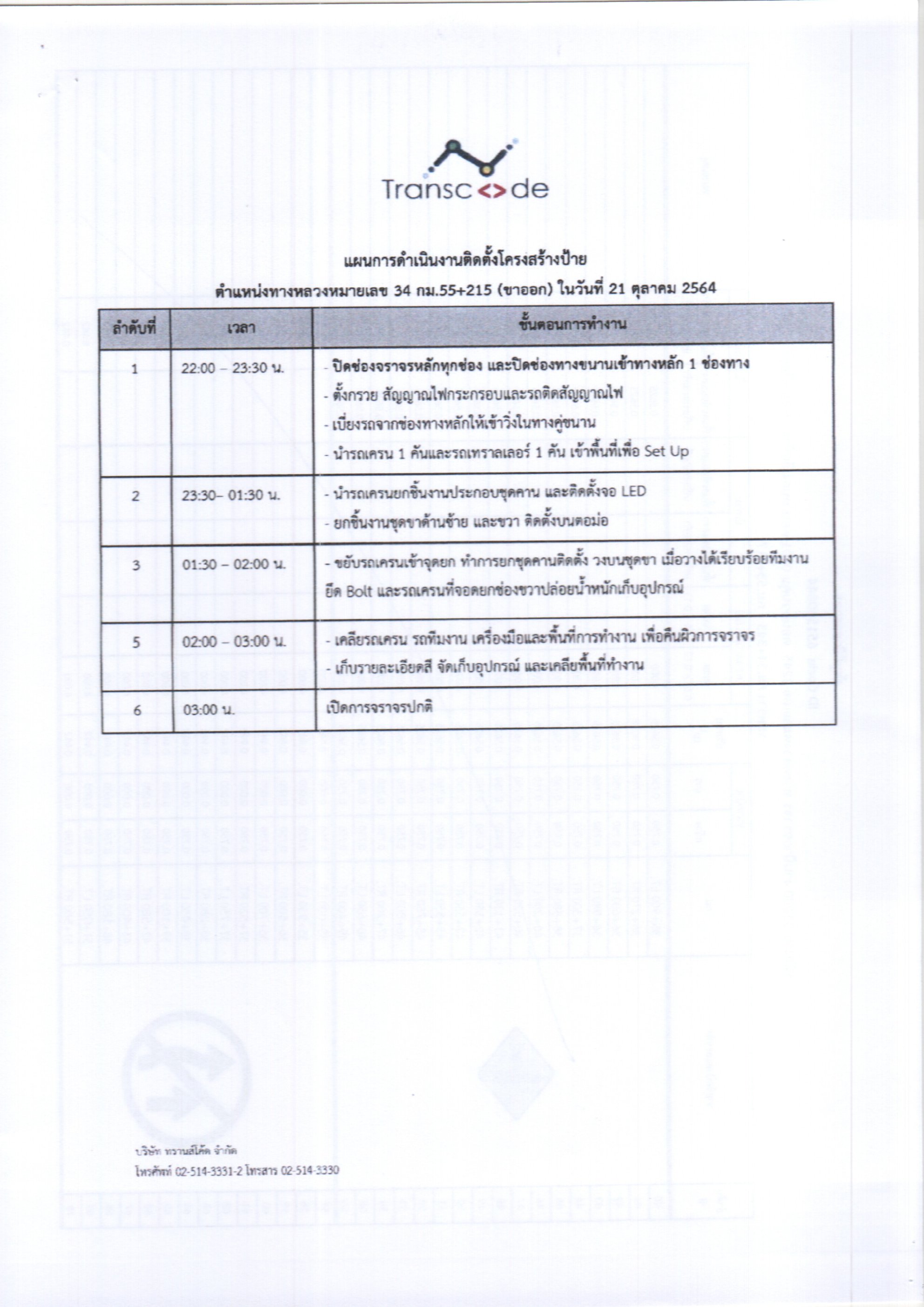 บนทางหลวงหมายเลข 34 กม. 55+215 (ขาออก กทม.) โดยมีรายละเอียดแผนการปฎิบัติงานแนบ