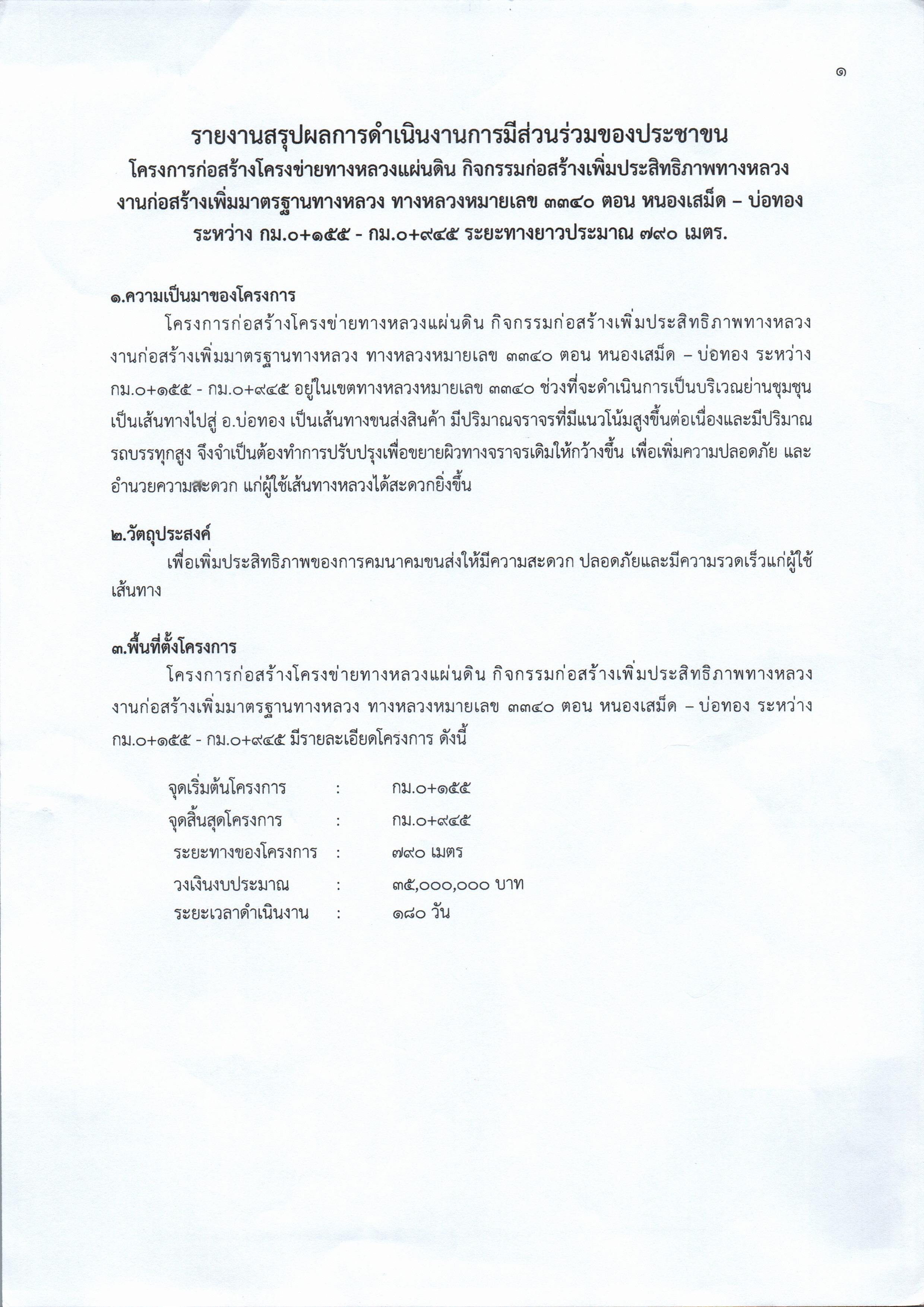 โครงการก่อสร้างโครงข่ายทางหลวงแผ่นดิน กิจกรรมงานก่อสร้างเพิ่มมาตรฐานทางหลวง ทางหลวงหมายเลข 3340 ตอน หนองเสม็ด - บ่อทอง ระหว่าง กม.0+155 - กม.0+945 มีรายละเอียดโครงการ ดังนี้