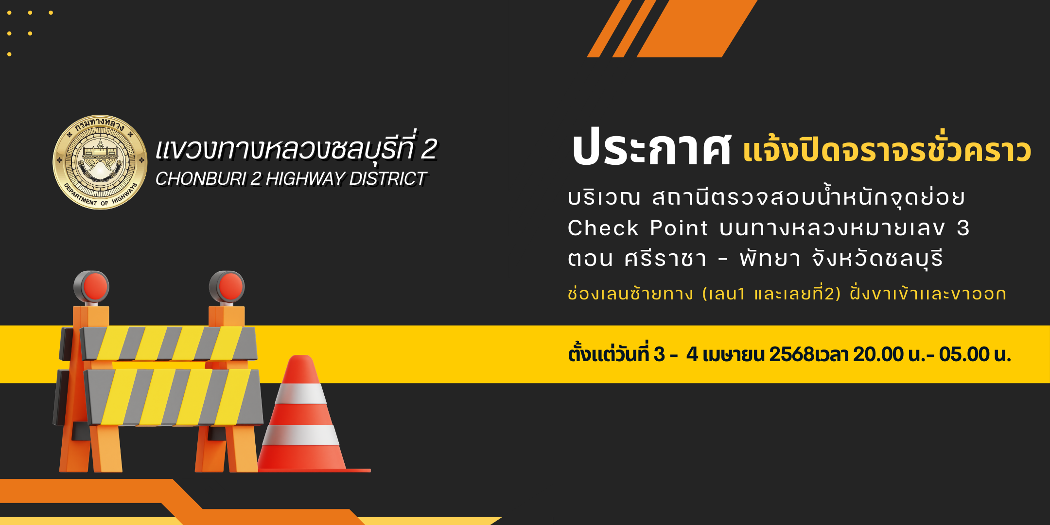 6 02/04/2568 ประกาศแจ้งปิดการจราจรขั่วคราว บริเวณ สถานีตรวจสอบน้ำหนักจุดย่อย Check Point บนทางหลวงหมายเลข 3