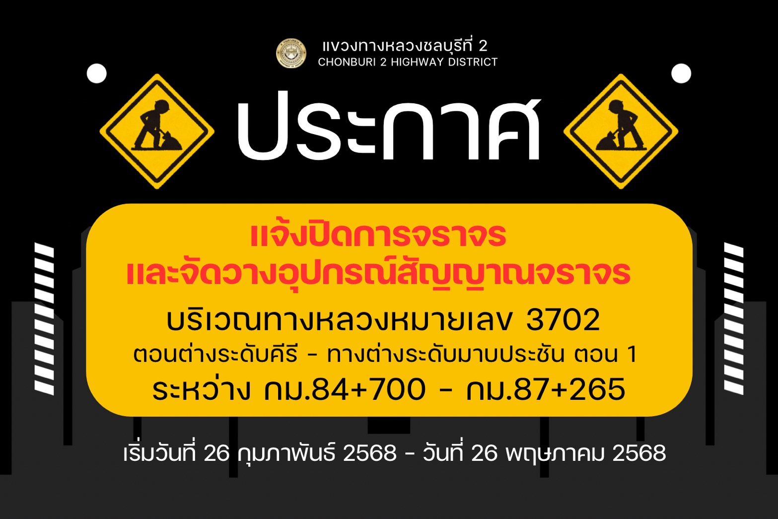 แจ้งพื้นที่ก่อสร้างงานจ้างเหมา ทำการกิจกรรมบำรุงรักษาทางหลวง งานซ่อมทางผิวแอสฟัลต์ บริเวณทางหลวงหมายเลข 3702