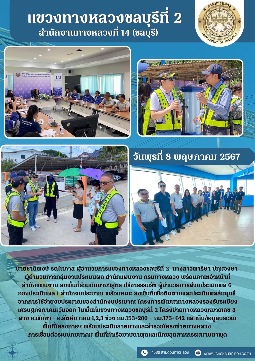 สำนักงบประมาณลงพื้นที่ติดตามและประเมินผลสัมฤทธิ์จากการใช้จ่ายงบประมาณของสำนักงบประมาณ โครงการพัฒนาทางหบวงรองรับระเบียงเศรษฐกิจภาคตะวันออก ในพื้นที่แขวงทางหลวงชลบุรีที่ 2 ระหว่างวันที่ 7-9 พฤษภาคม 2567