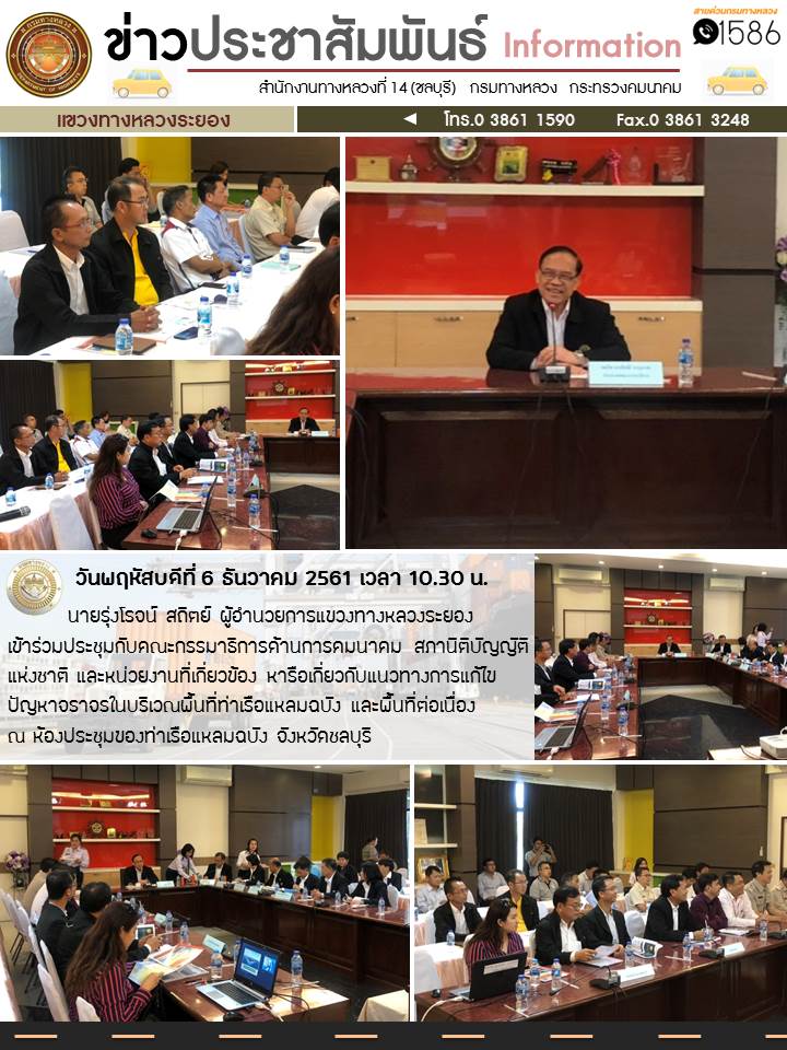วันพฤหัสบดีที่ 6 ธันวาคม 2561 เวลา 10.30 น. นายรุ่งโรจน์ สถิตย์ ผู้อำนวยการแขวงทางหลวงระยอง เข้าร่วมประชุมกับคณะกรรมาธิการด้านการคมนาคม สภานิติบัญญัติแห่งชาติ และหน่วยงานที่เกี่ยวข้อง หารือเกี่ยวกับแนวทางการแก้ไขปัญหาจราจรในบริเวณพื้นที่ท่าเรือแหลมฉบัง และพื้นที่ต่อเนื่อง ณ ห้องประชุมของท่าเรือแหลมฉบัง จังหวัดชลบุรี #แขวงทางหลวงระยอง #กรมทางหลวง #สายด่วนกรมทางหลวง1586 #เรารักกรมทางหลวง