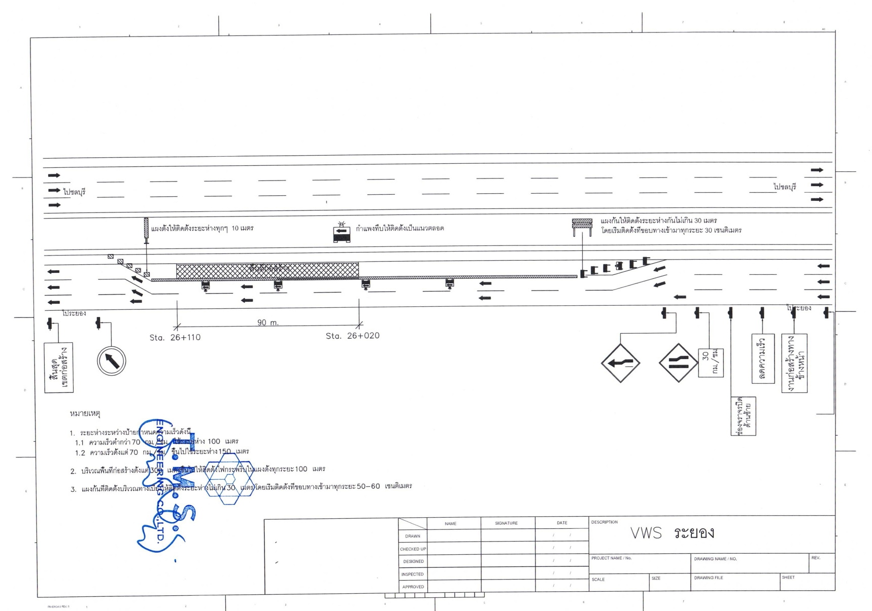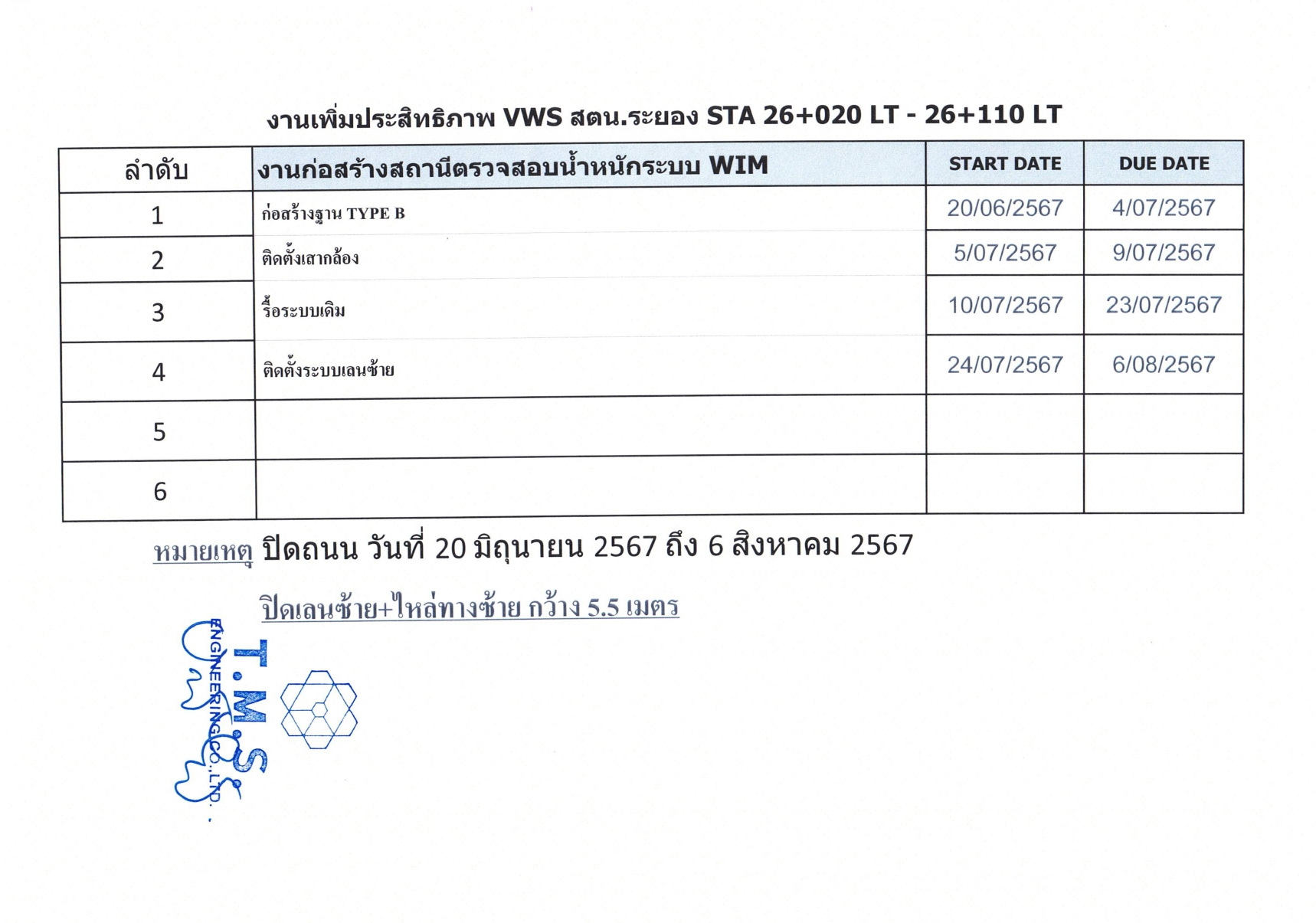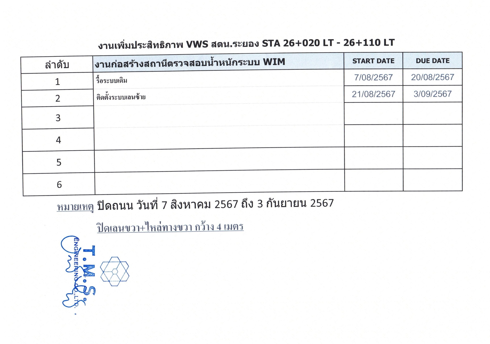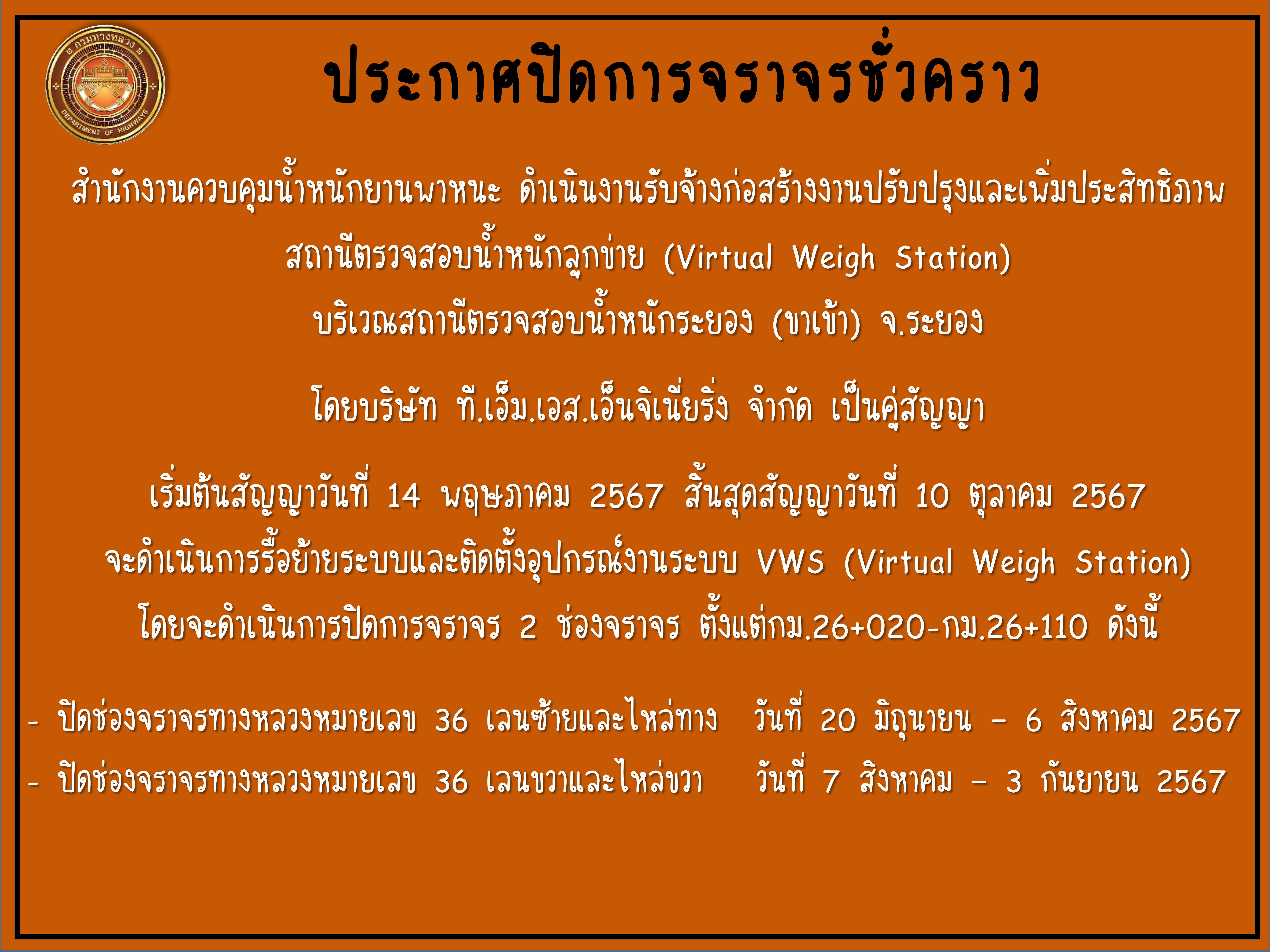 สำนักงานควบคุมน้ำหนักยานพาหนะ ดำเนินงานจ้างก่อสร้างงานปรับปรุงและเพิ่มประสิทธิภาพสถานีตรวจสอบน้ำหนักลูกข่าย (Virtual Weigh Station) สถานีตรวจสอบน้ำหนักระยอง (ขาเข้า) จ.ระยอง โดยมี บริษัท ที.เอ็ม.เอส.เอ็นจิเนี่ยริ่ง จำกัด เป็นคู่สัญญา จะดำเนินการปิดช่องจราจร บริเวณทางหลวงหมายเลข 36 ช่วงระหว่าง กม.26+020 - กม.26+110 ดังนี้
