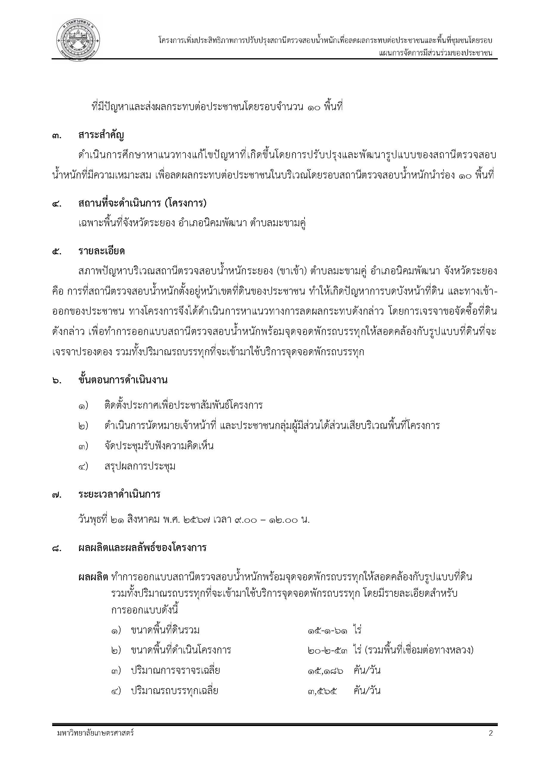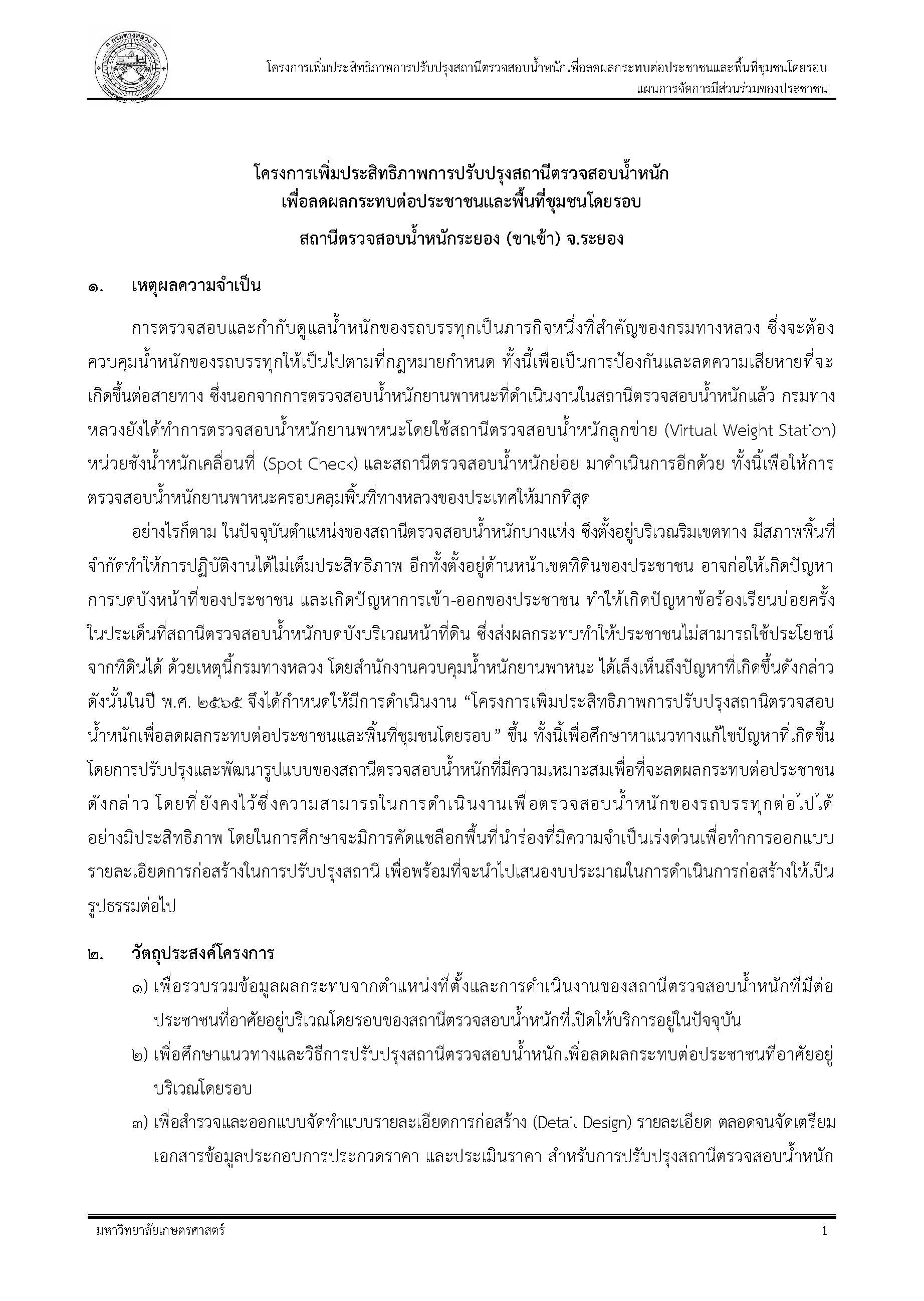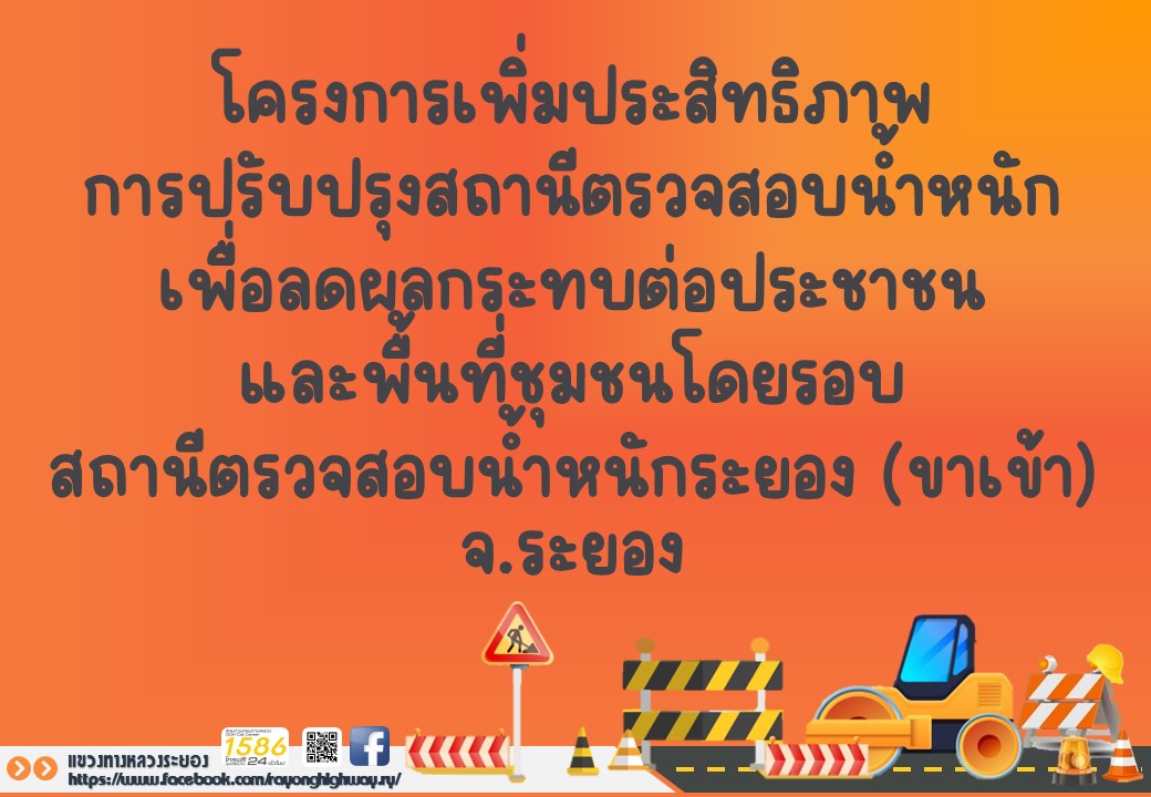 | โครงการเพิ่มประสิทธิภาพการปรับปรุงสถานีตรวจสอบน้ำหนัก เพื่อลดผลกระทบต่อประชาชนและพื้นที่ชุมชนโดยรอบ สถานีตรวจสอบน้ำหนักระยอง(ขาเข้า)จ.ระยอง | 138 | ดาวน์โหลด |