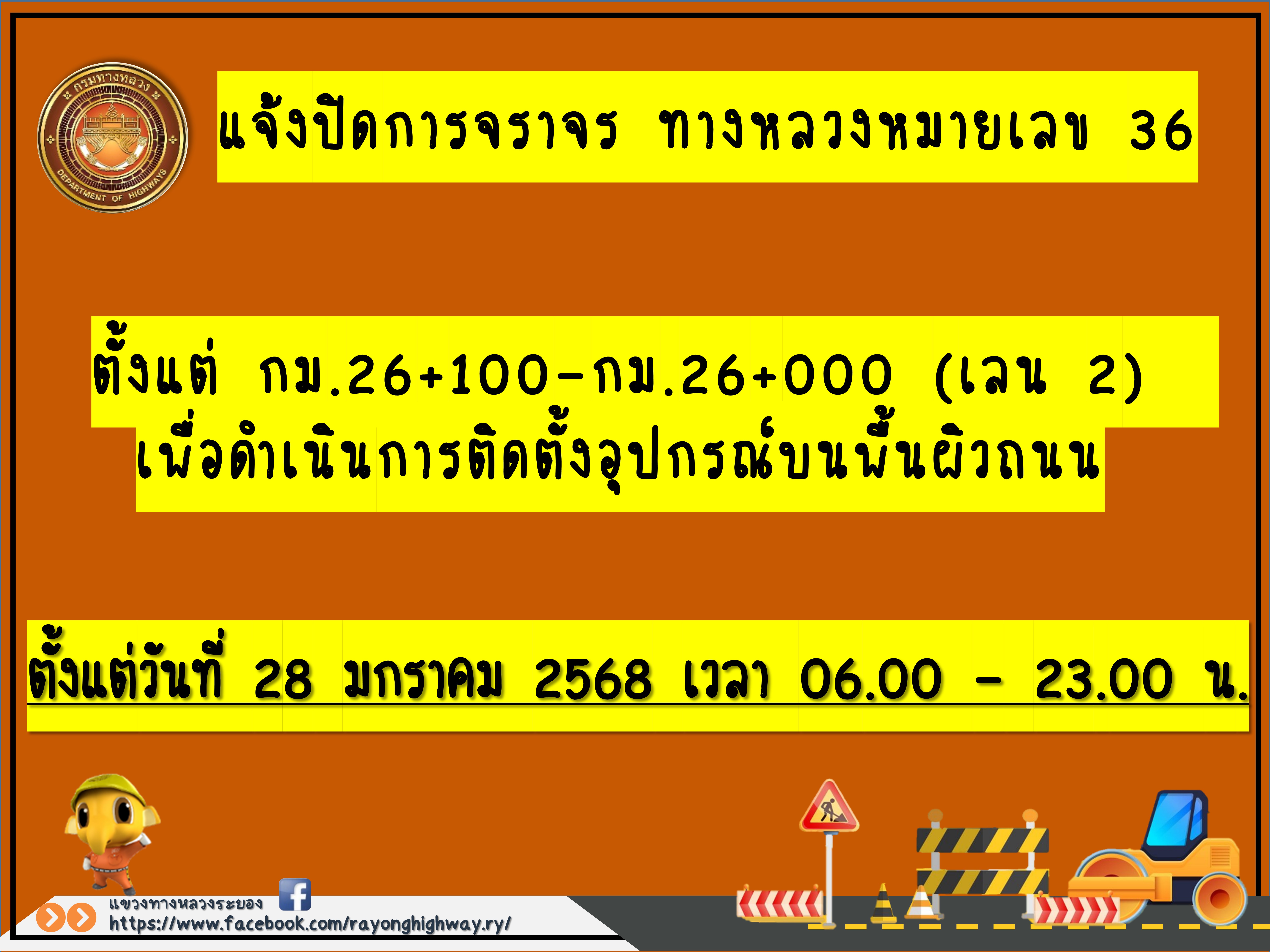 แจ้งปิดการจราจร สถานีตรวจสอบน้ำหนักระยอง (ขาเข้า) จ.ระยอง 1 แห่ง ช่วง กม.26+100 - กม.26+000 ทางหลวงหมายเลข 36 (เลน 2 ) ??วันที่ 28 มกราคม 2568 เวลา 06.00 - 23.00 น.