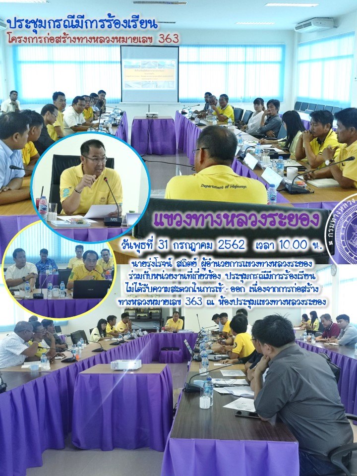 วันพุธที่ 31 กรกฎาคม 2562 เวลา 10.00 น. นายรุ่งโรจน์ สถิตย์ ผู้อำนวยการแขวงทางหลวงระยอง ร่วมกับหน่วยงานที่เกี่ยวข้อง ประชุมกรณีมีการร้องเรียนไม่ได้รับความสะดวกในการเข้า-ออก เนื่องจากการก่อสร้างทางหลวงหมายเลข 363 ณ ห้องประชุมแขวงทางหลวงระยอง #แขวงทางหลวงระยอง #กรมทางหลวง #สายด่วนกรมทางหลวง1586