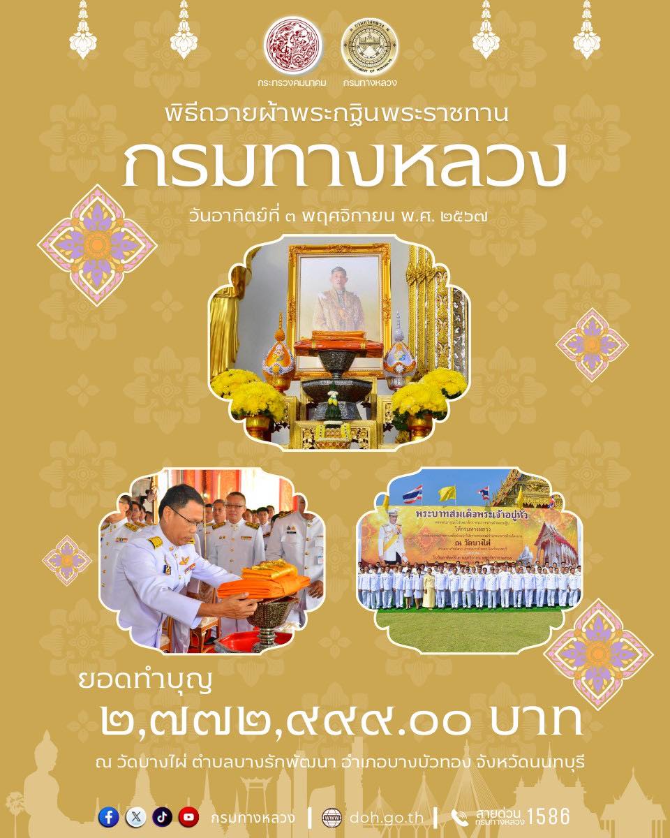 **ยอดเงินที่ร่วมบุญการบริจาคอนุโมทนาถวายผ้าพระกฐินพระราชทานกรมทางหลวง ประจำปี 2567 เป็นจำนวนเงินทั้งสิ้น 2,772,999 บาท**