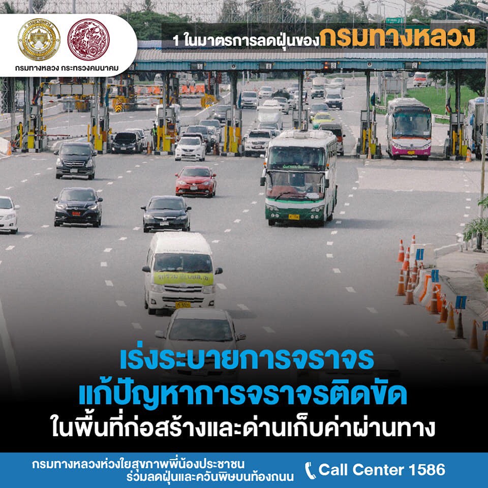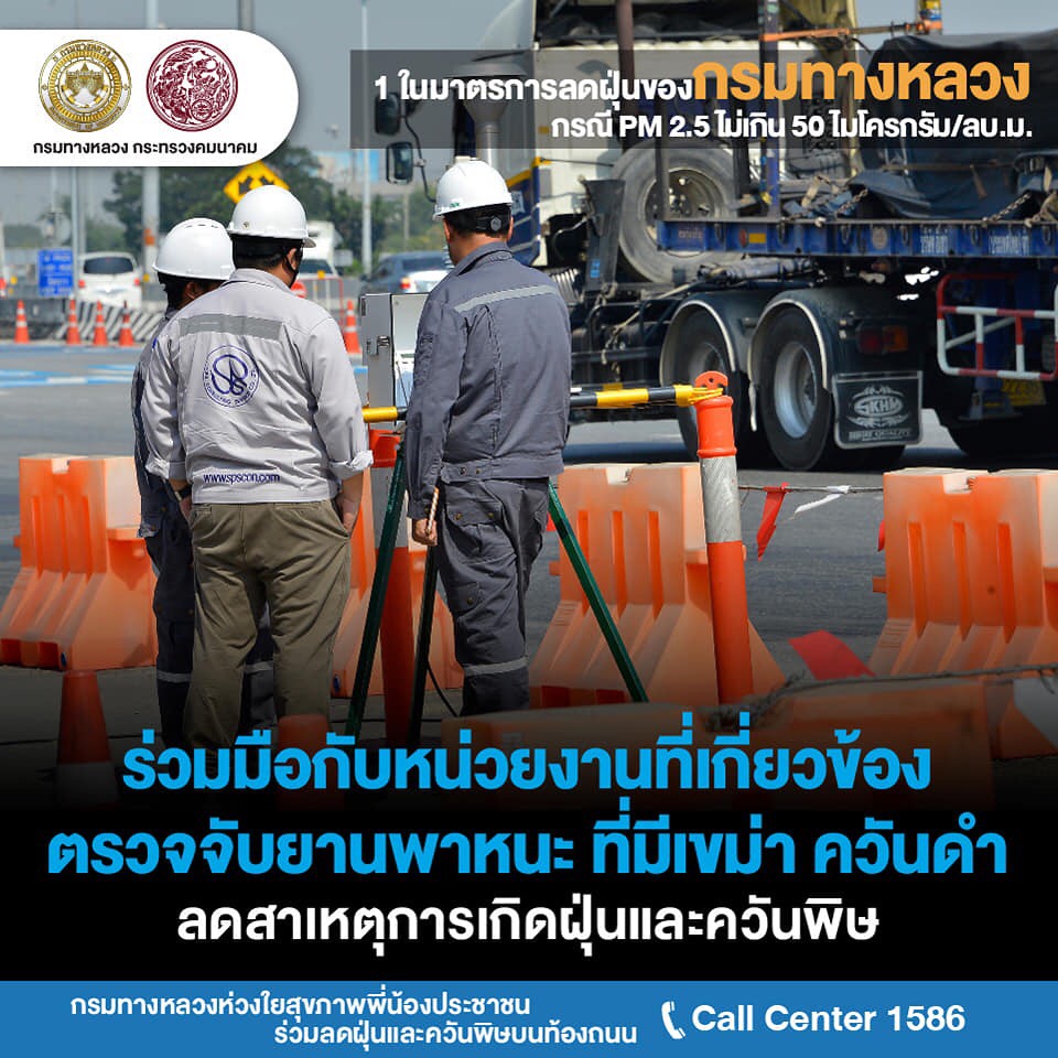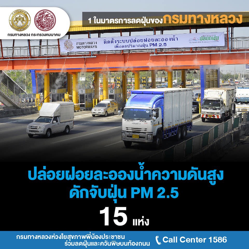 กรมทางหลวงเดินหน้าแก้ไขปัญหามลพิษ PM 2.5ขานรับวาระแห่งชาติ กรมทางหลวงสั่งหน่วยงานในสังกัดเร่งแก้ไขปัญหา PM 2.5 งัดมาตรการเข้มงวดงานก่อสร้าง-บำรุงทางให้ก่อฝุ่นน้อยที่สุด ติดตั้งเครื่องปล่อยละอองน้ำจับฝุ่น 15 แห่ง และจับมือหลายหน่วยงานเข้มใช้รถควันดำ จอดแช่ ลดค่าธรรมเนียมผ่านทาง M-Pass และ Easy Pass จูงใจใช้เพิ่มลดปัญหารถติดหน้าด่านก่อมลพิษ