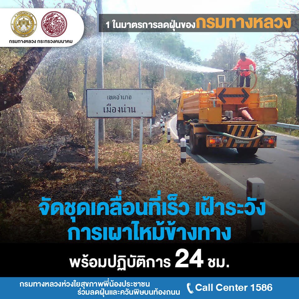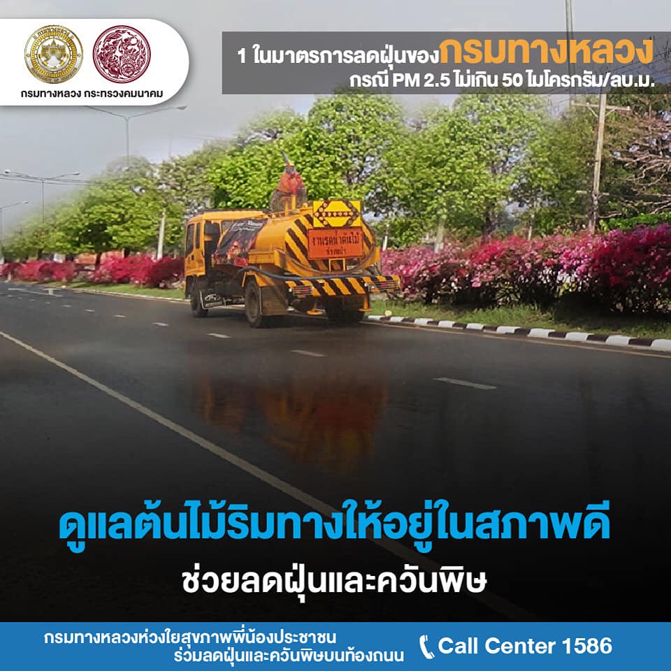นายสราวุธ ทรงศิวิไล อธิบดีกรมทางหลวง (ทล.) เปิดเผยว่า สั่งการให้สำนักงานทางหลวงแขวงทางหลวง และหมวดทางหลวงทั่วประเทศ ดำเนินการตามแผนปฏิบัติการขับเคลื่อนวาระแห่งชาติของรัฐบาลในการแก้ไขปัญหามลพิษด้านฝุ่นละอองขนาดเล็ก หรือ PM 2.5 ด้วยการกำหนดมาตรการป้องกันแก้ไขปัญหาฝุ่นละอองใน 2 กรณี คือ กรณีที่ระดับปริมาณฝุ่น PM 2.5 มีค่าไม่เกิน 50 ไมโครกรัมต่อลูกบาศก์เมตร และกรณีเกิดสถานการณ์วิกฤตที่ระดับปริมาณฝุ่น PM 2.5 มีค่าเกิน 50 ไมโครกรัมต่อลูกบาศก์เมตรขึ้นไป กรณีที่ระดับปริมาณฝุ่น PM 2.5 มีค่าไม่เกิน 50 ไมโครกรัมต่อลูกบาศก์เมตร กรมทางหลวง จะดำเนินการมาตการ ดังนี้ ด้านงานก่อสร้างและบำรุงทาง มีการจำกัดพื้นที่หน้างานที่ก่อให้เกิดฝุ่นละอองให้น้อยที่สุดเท่าที่จำเป็น การเข้มงวดมาตรการป้องกันและลดฝุ่นละออง เช่น การปิดคลุมวัสดุก่อสร้างในการเก็บกองและ ขนย้าย การตรวจสอบสภาพเครื่องจักรก่อสร้างให้อยู่ในสภาพดี ห้ามใช้เครื่องจักรที่ก่อให้เกิดเขม่าควันดำ และการงดใช้น้ำมันเครื่องที่ใช้แล้วกับเครื่องจักรอุปกรณ์ เป็นต้น ส่วนขยะที่เกิดจากการก่อสร้างจะมีการจัดการอย่างเหมาะสม ห้ามเผาขยะโดยเด็ดขาด โดยพิจารณาวิธีการก่อสร้างที่ใช้การเผาไหม้เชื้อเพลิงน้อย เช่น warm mix asphalt การทำความสะอาด เศษฝุ่น เศษวัสดุที่สะสมบริเวณขอบทางและเกาะกลางอย่างสม่ำเสมอ รวมทั้งบูรณาการการทำงานร่วมกับจังหวัดทั่วประเทศในการลดการเกิดฝุ่นควัน และการอำนวยความสะดวกต่อการจราจรบนถนนบริเวณพื้นที่ก่อสร้าง เพื่อไม่ให้เกิดการจราจรติดขัดจากการก่อสร้างและบำรุงทาง ด้านงานการให้บริการผู้ใช้ทางและบริหารจัดการจราจรบนสายทาง จะประสานความร่วมมือระหว่างตำรวจทางหลวงและหน่วยงานที่เกี่ยวข้อง เช่น กรมควบคุมมลพิษในการตรวจจับรถยนต์ที่มีเขม่าควันดำ และเข้มงวดไม่ให้มีการจอดรถในพื้นที่ผิวถนนที่มีการจราจรแออัด จัดการจราจรให้ลื่นไหลลด การติดขัด รวมทั้งการบำรุงรักษาต้นไม้ริมทางหลวงให้อยู่ในสภาพดี เพื่อช่วยจับฝุ่นละอองจากถนน และเฝ้าระวังการเกิดปัญหาไฟป่าโดยการจัดชุดเคลื่อนที่เร็วพร้อมอุปกรณ์ในการป้องกันและควบคุม ด้านงานสำนักงาน ด้วยการลดการเดินทางของบุคลากร พิจารณาใช้เทคโนโลยีในการทำงานที่ช่วยลดการเดินทาง ลดการใช้ยานพาหนะส่วนตัว โดยเปลี่ยนการขนส่งสาธารณะโดยเฉพาะรถไฟฟ้า ตลอดจน การใช้รถยนต์ร่วมกัน (Carpool) สำหรับการเดินทางเส้นทางเดียวกัน นอกจากนั้นยังมีการจัดการขยะอย่างเหมาะสมโดยใช้วิธีการห้ามเผาโดยเด็ดขาด และรณรงค์ให้บุคลากรประหยัดพลังงานในส